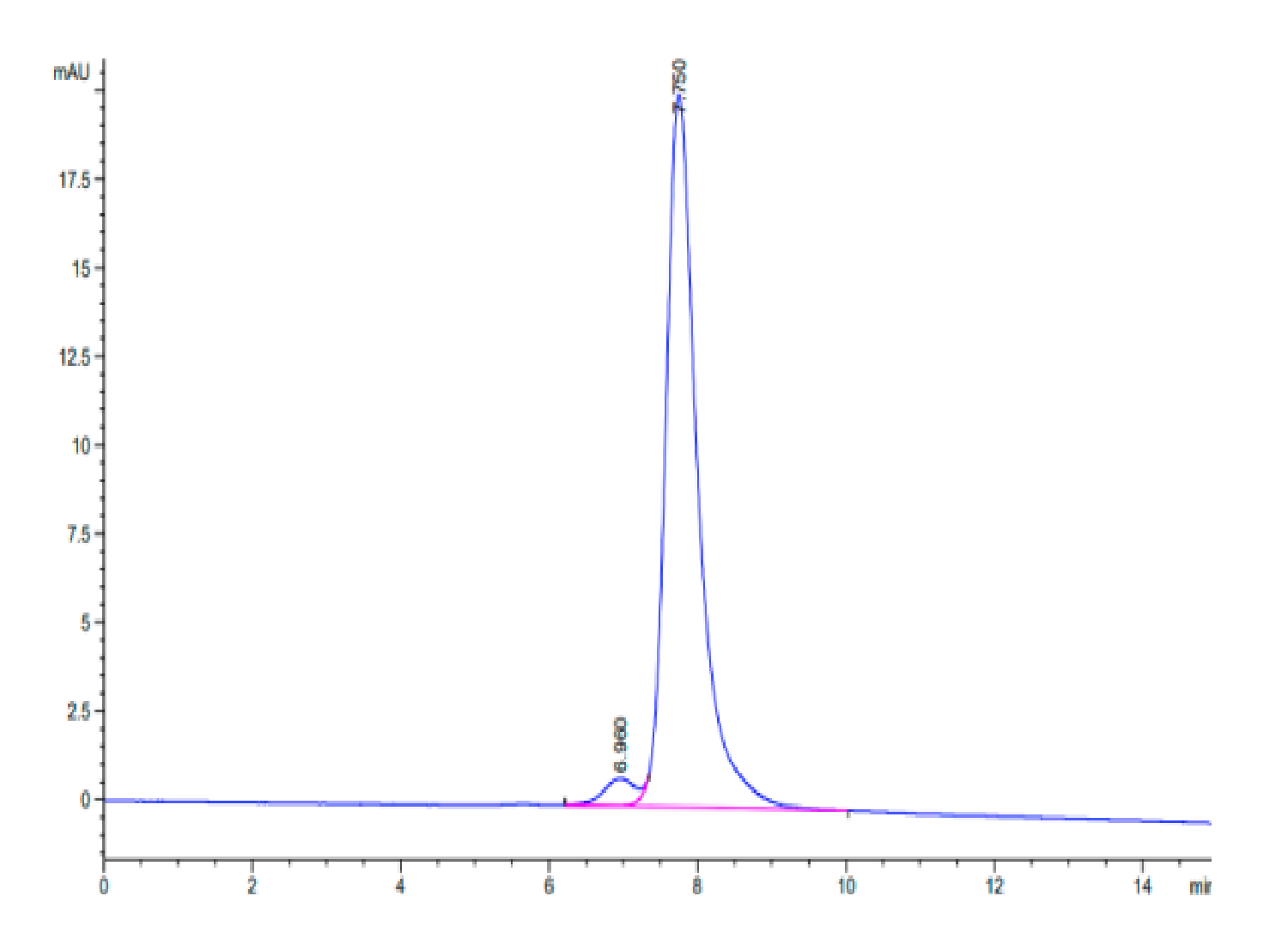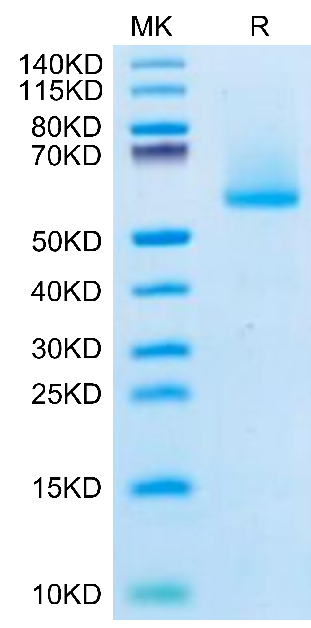 The protein has a predicted MW of 46.9 kDa. Due to glycosylation, the protein migrates to 55-65 kDa based on Bis-Tris PAGE result.