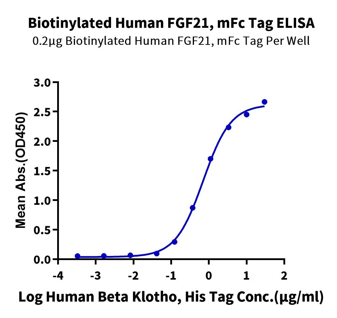 Recombinant Biotinylated Human FGF21 Protein is expressed from HEK293 with mFc (IgG1) tag and Avi tag at the N-Terminus.It contains His29-Ser209 [Accession | Q9NSA1].