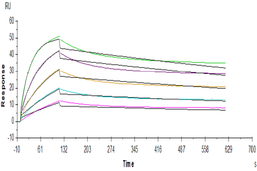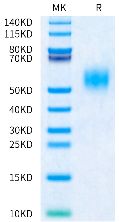 The protein has a predicted MW of 26.5 kDa. Due to glycosylation, the protein migrates to 50-65 kDa based on Bis-Tris PAGE result.