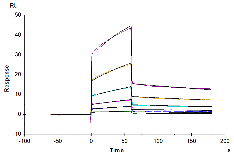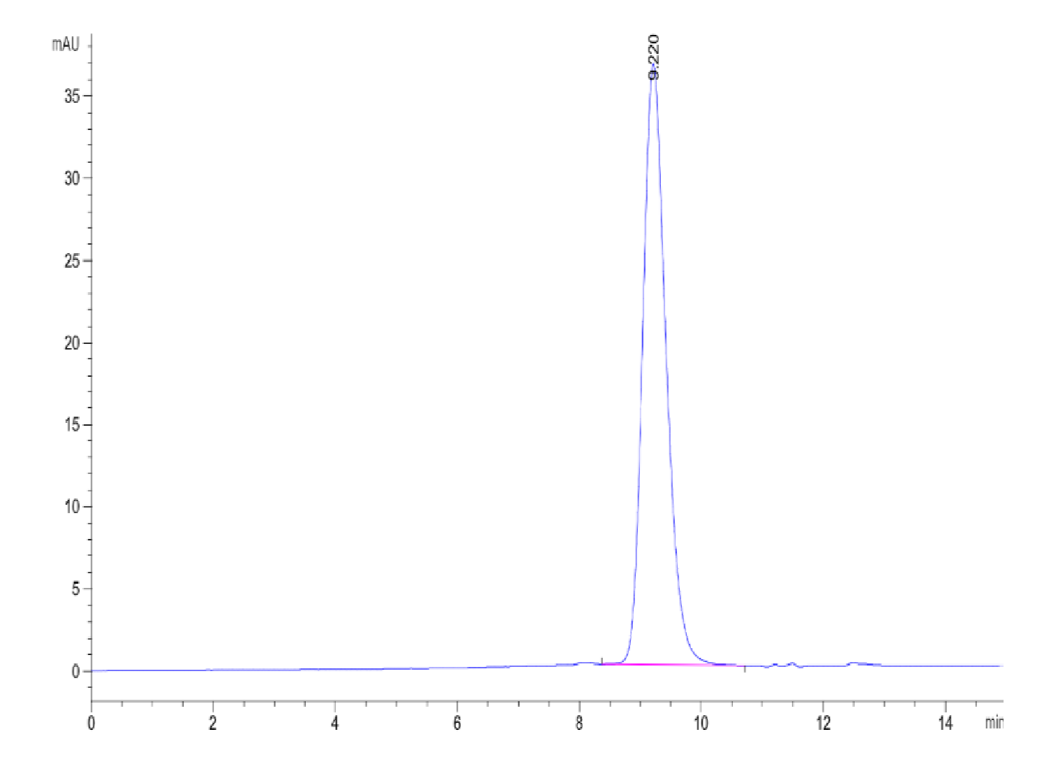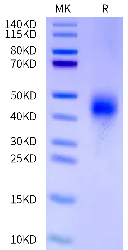 The protein has a predicted MW of 23.97 kDa. Due to glycosylation, the protein migrates to 40-50 kDa based on Bis-Tris PAGE result.