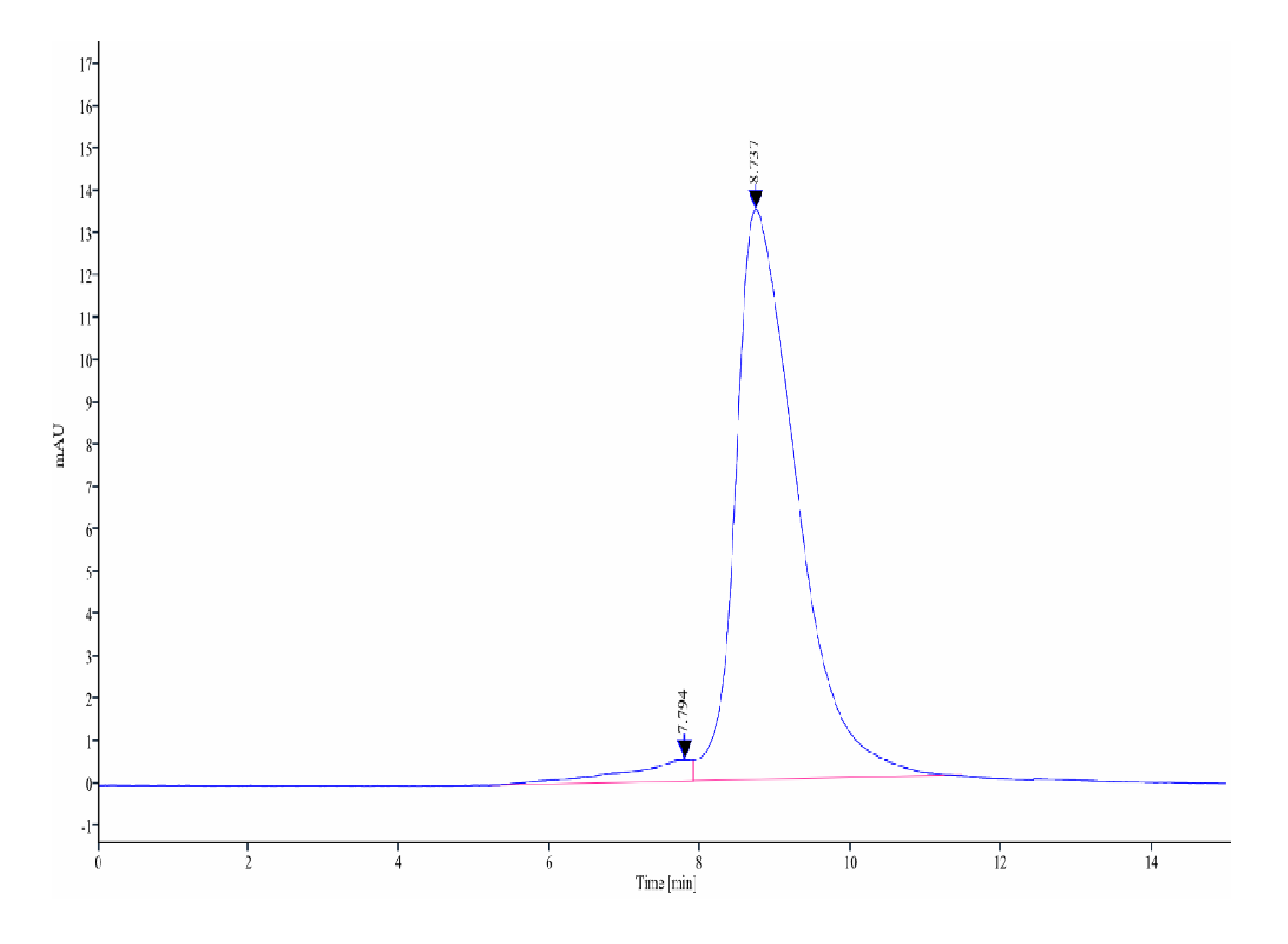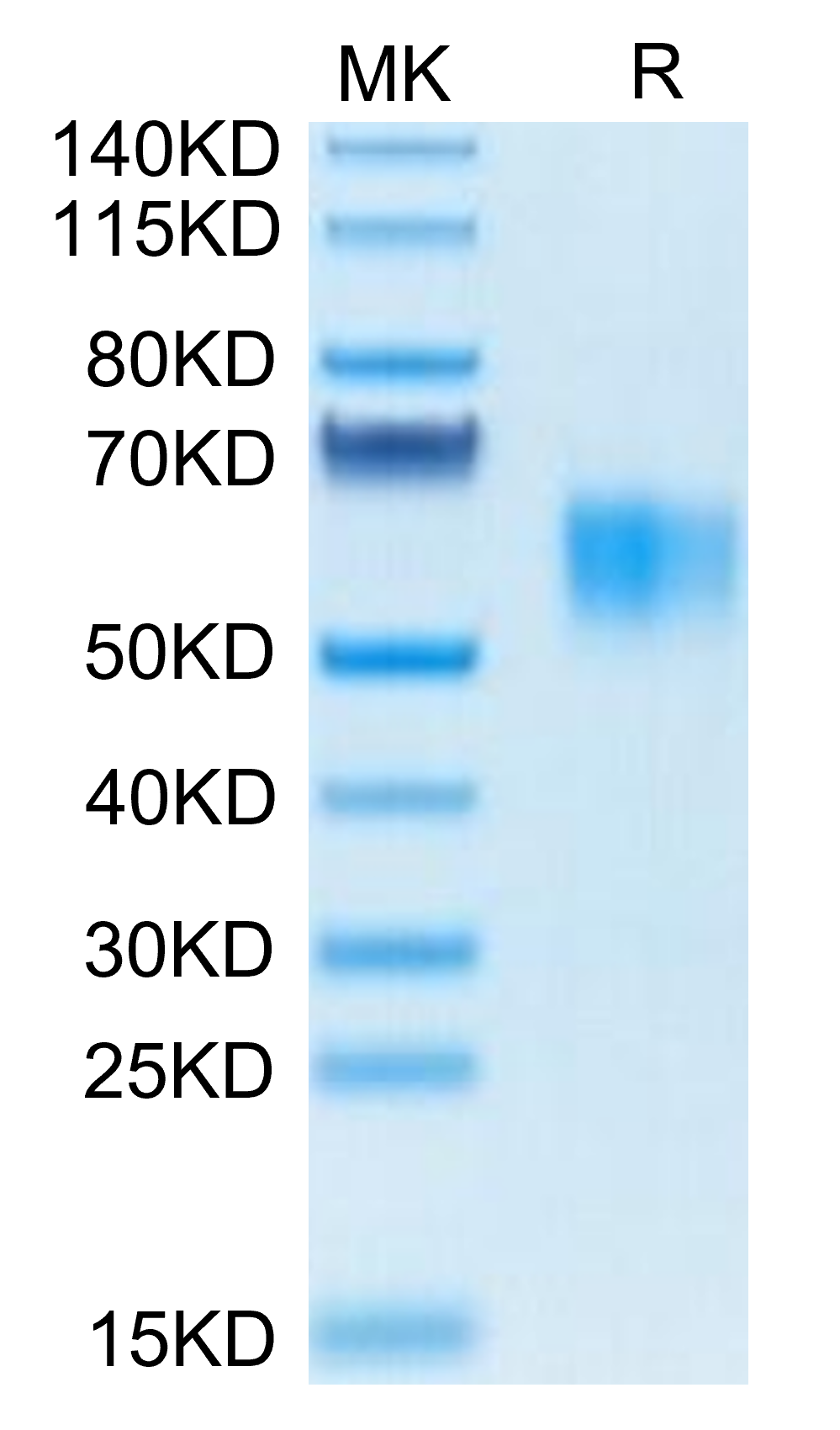 The protein has a predicted MW of 33.5 kDa. Due to glycosylation, the protein migrates to 55-68 kDa based on Bis-Tris PAGE result.