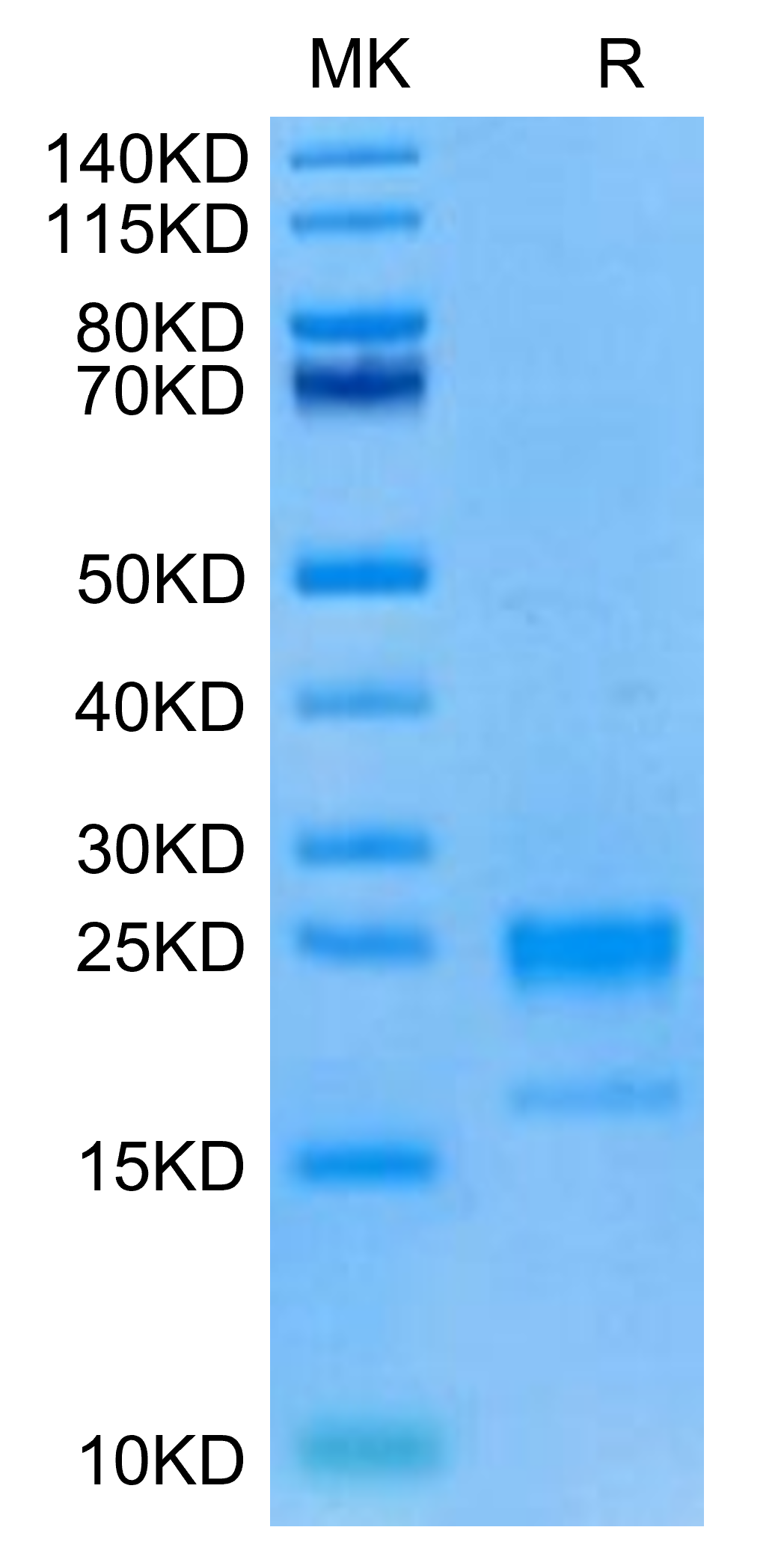 The protein has a predicted MW of 15.62 kDa. Due to glycosylation, the protein migrates to 17-27 kDa based on Bis-Tris PAGE result. |