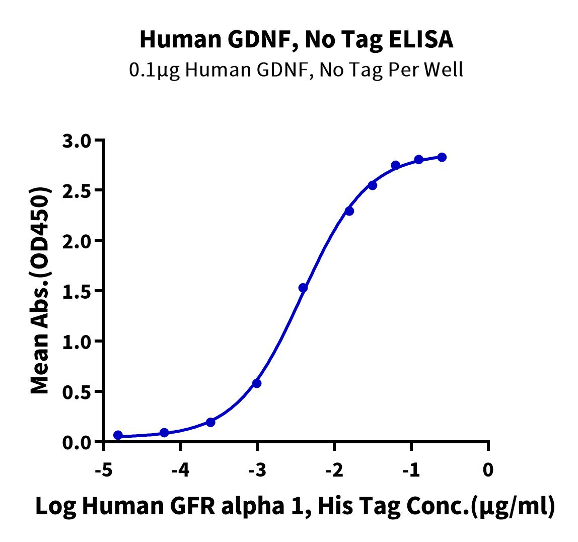 Immobilized Human GDNF, No Tag at 1 μg/ml (100μl/well) on the plate. Dose response curve for Human GFR alpha 1, His Tag with the EC50 of 3.8ng/ml determined by ELISA (QC Test).