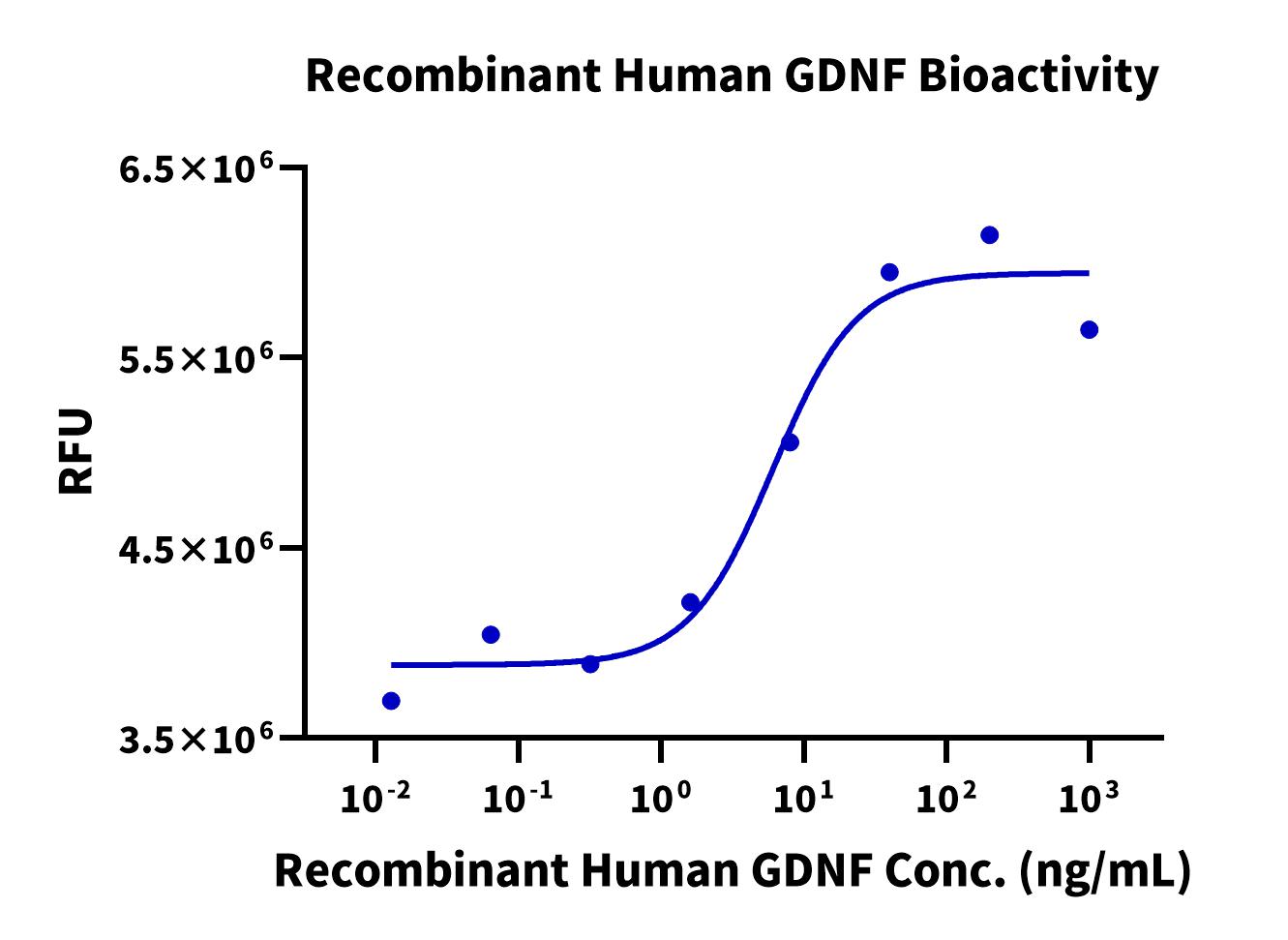 Measured in a cell proliferation assay using SH‑SY5Y human neuroblastoma cells. The ED50 for this effect is 2‑12 ng/mL in the presence of Recombinant Human GFR alpha ‑1/GDNF R alpha ‑1 Fc Chimera. (QC Test)