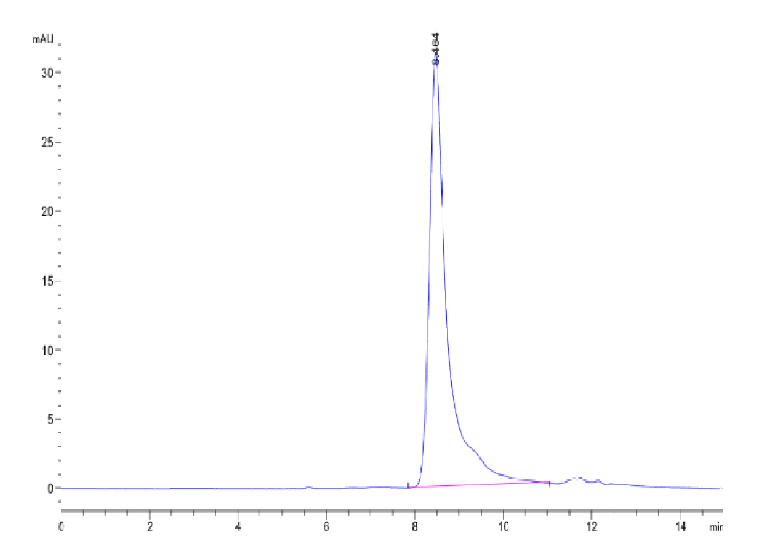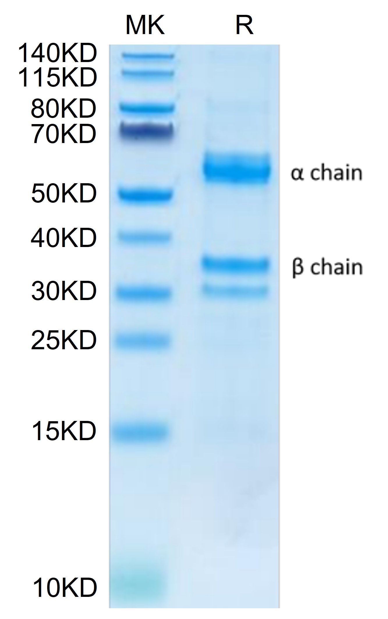 The HGF single chain can be processed into the active form of disulfide-linked heterodimer of α and β chain.The protein has a predicted MW of 79.6 kDa (after cleavage of the signal peptide). Due to glycosylation, the protein migrates to 60-65 kDa and 30-40 kDa corresponding to α chain and β chain based on Bis-Tris PAGE result.
