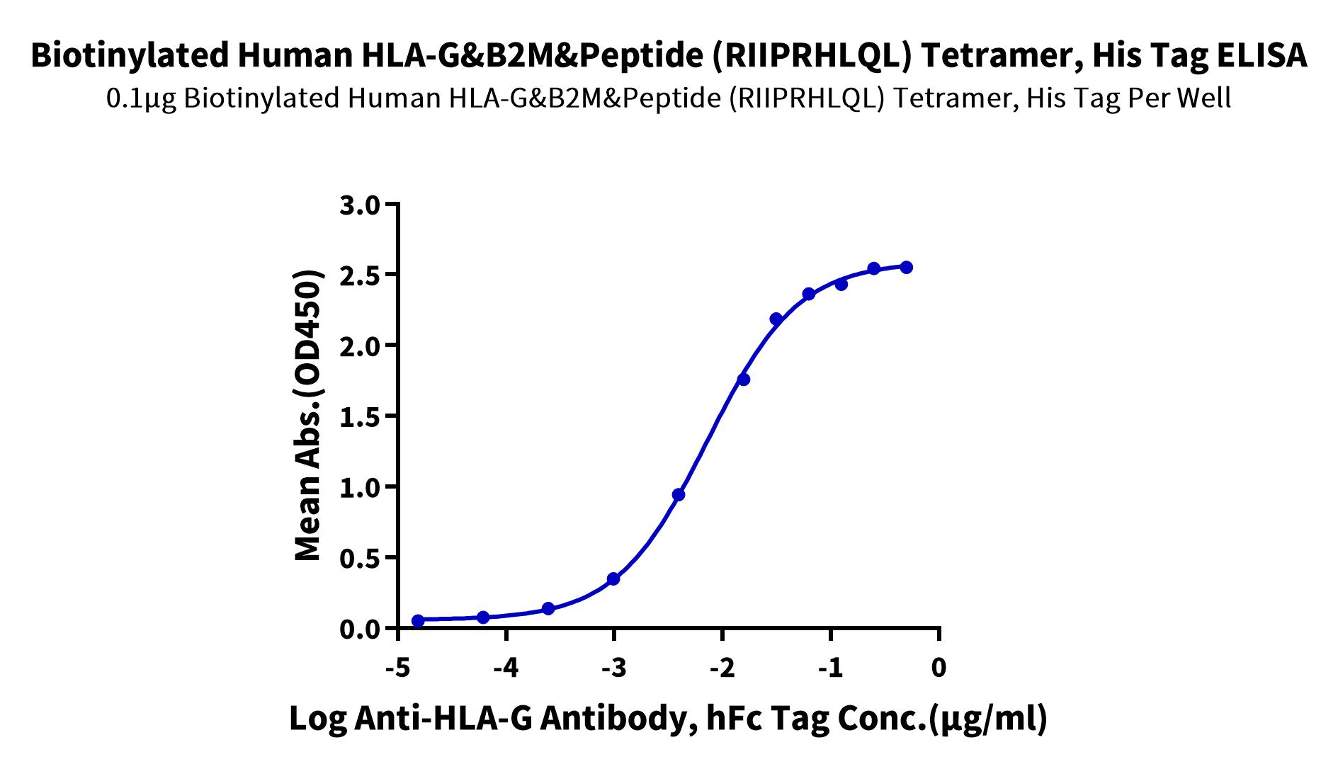 Recombinant Biotinylated Human HLA-G&B2M&Peptide (RIIPRHLQL) Tetramer Protein is expressed from HEK293 with His tag and Avi tag at the C-Terminus,tetramer is assembled by biotinylated monomer and streptavidin.It contains Gly25-Thr305(HLA-G), Ile21-Met119(B2M) and RIIPRHLQL peptide [Accession | P17693-1(HLA-G)&P61769(B2M)&RIIPRHLQL].