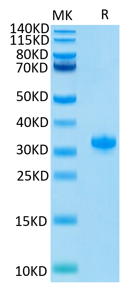 The protein has a predicted MW of 25.8 kDa. Due to glycosylation, the protein migrates to 30-35 kDa based on Bis-Tris PAGE result.