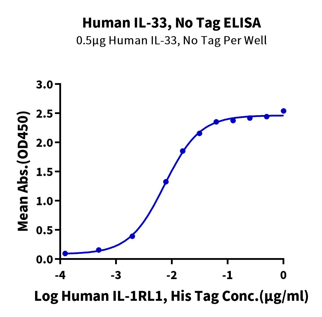 Interleukin-33 (IL-33) is a cytokine belonging to the IL-1 family, playing a role in inflammatory, infectious and autoimmune diseases and expressed in the cellular nucleus in several tissues. High levels of IL-33 are expressed in epithelial barrier tissues and endothelial barriers. ST2 is a receptor for IL-33, expressed selectively on a subset of Th2 cells, mediating some of their functions.