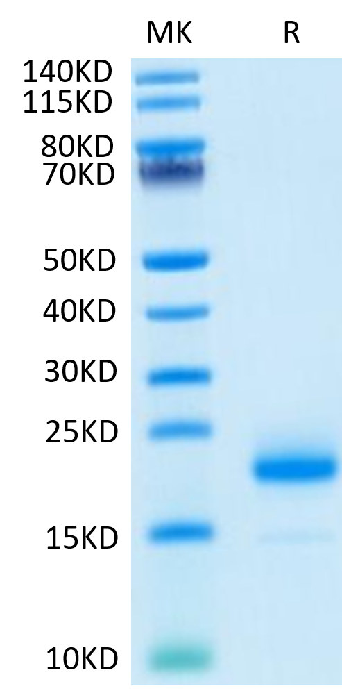 The protein has a predicted MW of 14.96 kDa. Due to glycosylation, the protein migrates to 23-25 kDa based on Bis-Tris PAGE result.