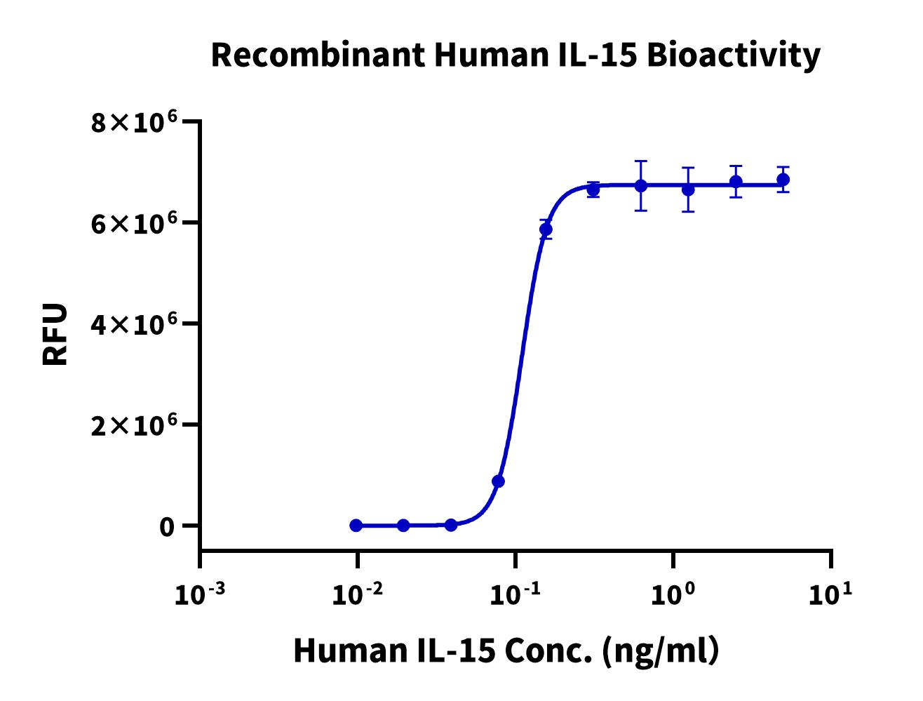 Measured in a cell proliferation assay using CTLL-2 cells. The ED50 for this effect is 0.1 - 0.3 ng/mL. The specific activity of recombinant human IL-15 is > 1 × 10^7 units/mg, which is calibrated against the human IL-15 reference standard (NIBSC code: 95/554) (QC Test).
