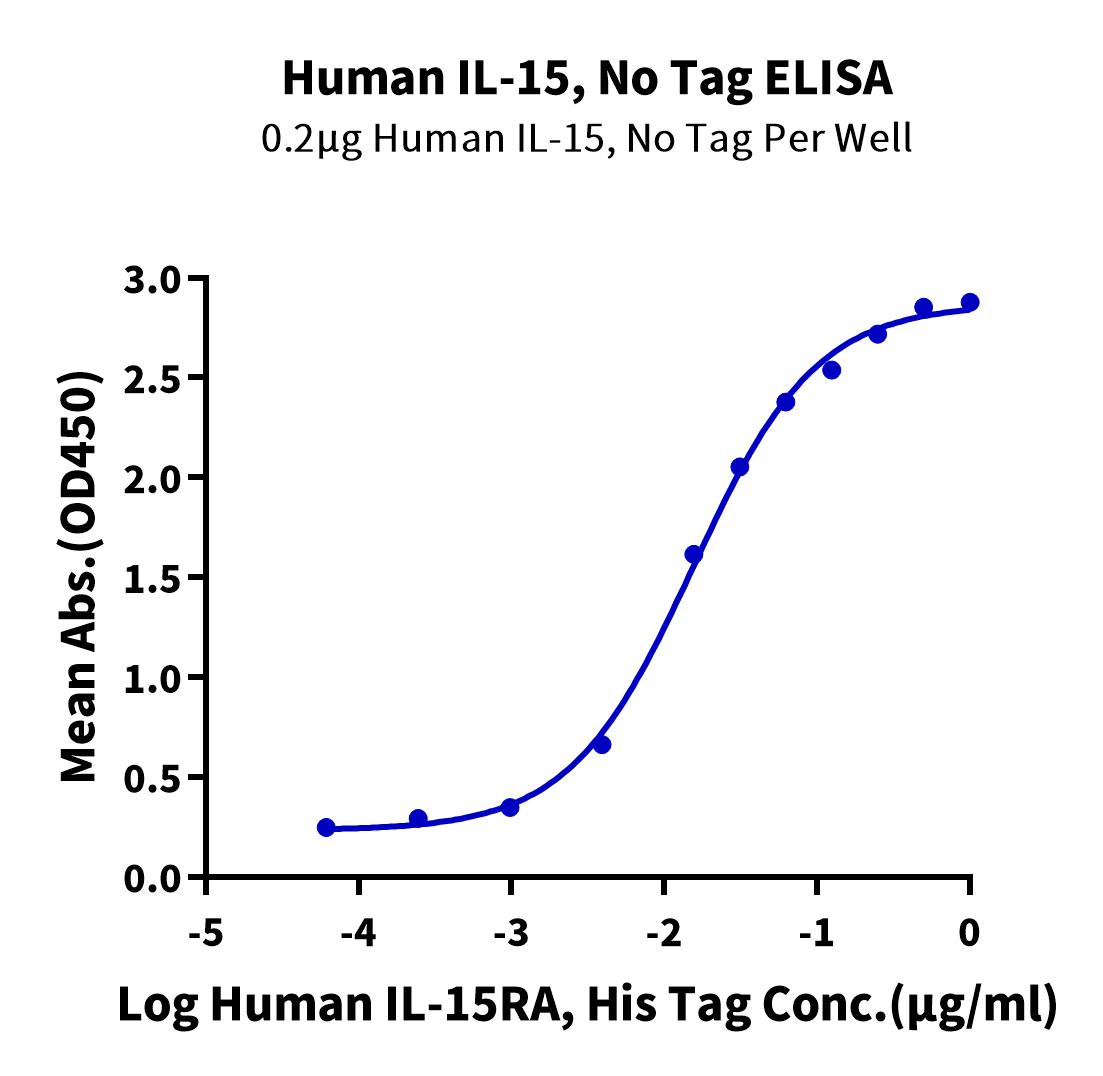 Immobilized Human IL-15, No Tag at 2 μg/ml (100 μl/Well) on the plate. Dose response curve for Human IL-15RA, His Tag with the EC50 of 15.4 ng/ml determined by ELISA.