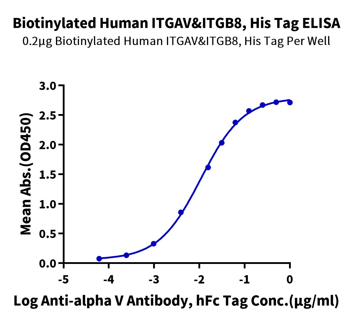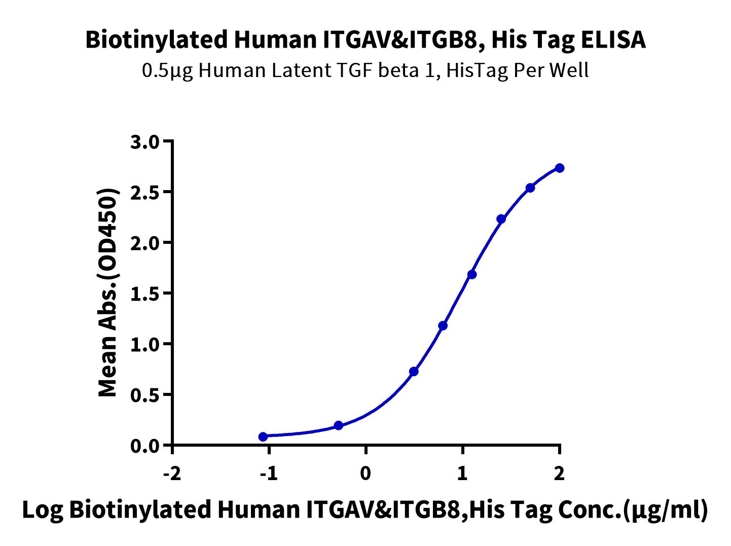 Recombinant Biotinylated Human Integrin alpha V beta 8 (ITGAV&ITGB8) Heterodimer Protein is expressed from HEK293 with His tag and Avi tag at the C-Terminus of ITGAV.It contains Phe31-Val992(ITGAV) acidic tail and Glu43-Arg684(ITGB8) basic tail [Accession | P06756-1(ITGAV)&P26012-1(ITGB8)].