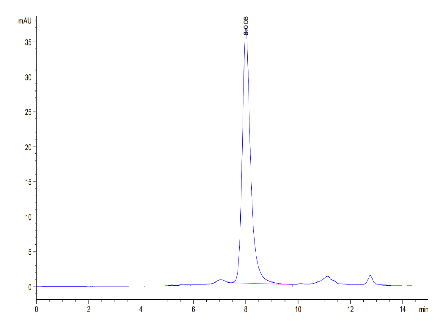 The protein has a predicted MW of 50.2 kDa. Due to glycosylation, the protein migrates to 70-75 kDa based on Bis-Tris PAGE result.