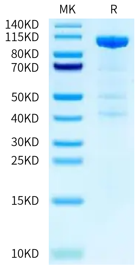 The protein has a predicted MW of 95.32 kDa. Due to glycosylation, the protein migrates to 97-110 kDa based on Bis-Tris PAGE result.