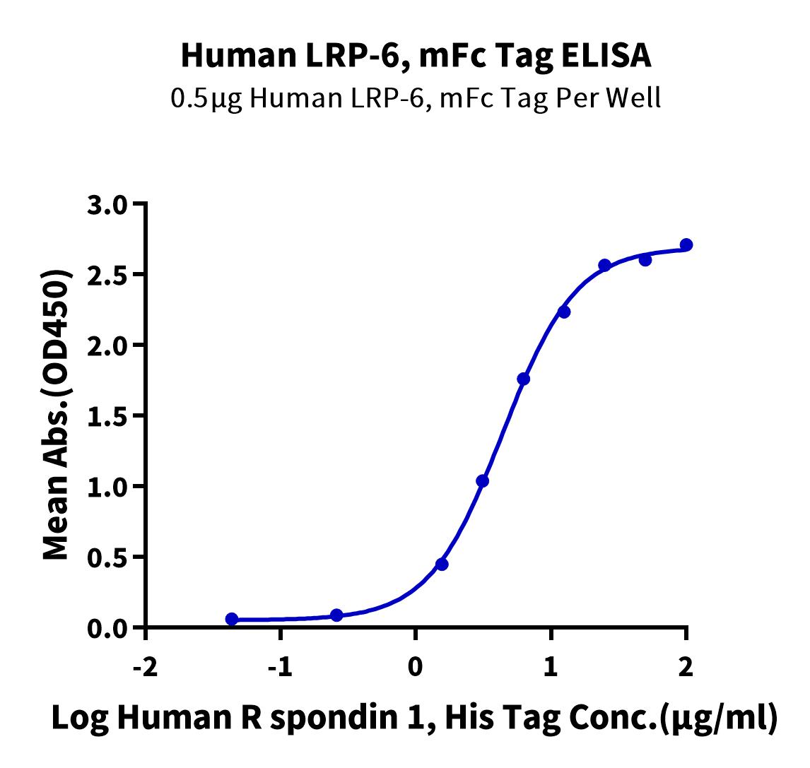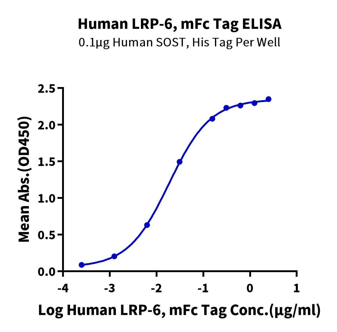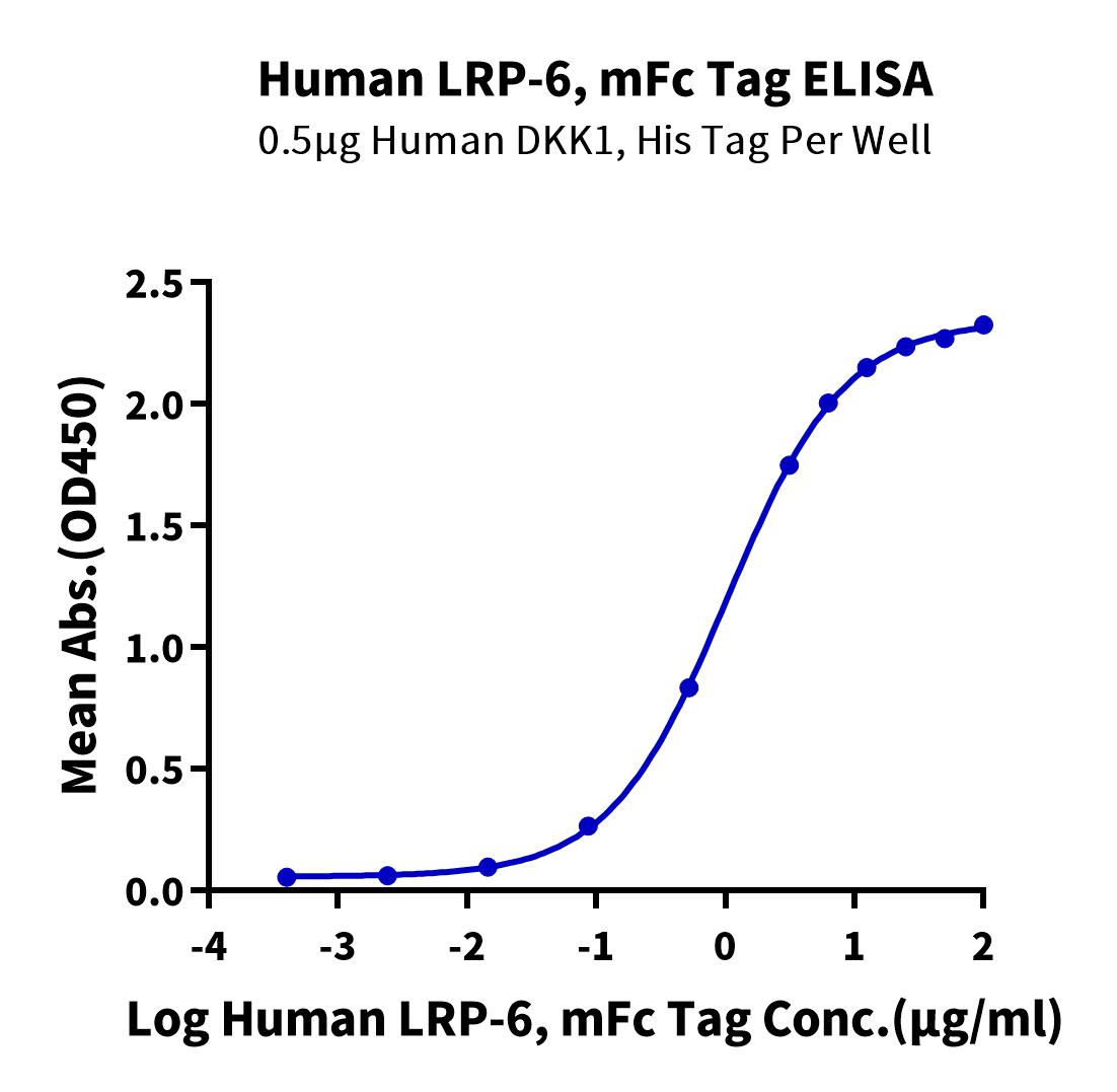 Recombinant Human LRP-6 Protein is expressed from HEK293 with mFc (IgG2a) tag at the C-terminus.It contains Ala20-Pro630 [Accession | O75581-1].