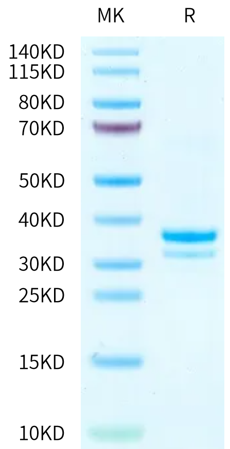 The protein has a predicted MW of 25.7 kDa. Due to glycosylation, the protein migrates to 30-40 kDa based on Bis-Tris PAGE result.