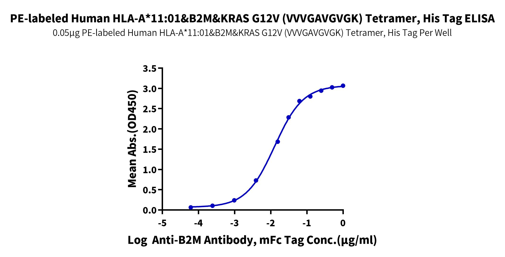 Recombinant PE-Labeled Human HLA-A*11:01&B2M&KRAS G12V (VVVGAVGVGK) Tetramer Protein is expressed from HEK293 with His tag and Avi tag at the C-Terminus. PE-labeled Human HLA-A*11:01&B2M&KRAS G12V (VVVGAVGVGK) Tetramer is assembled by biotinylated monomer and PE-Labeled streptavidin. It contains Gly25-Thr305(HLA-A*11:01), Ile21-Met119(B2M) and VVVGAVGVGK peptide [Accession | AAV53343.1(HLA-A*11:01)&P61769(B2M)&VVVGAVGVGK].