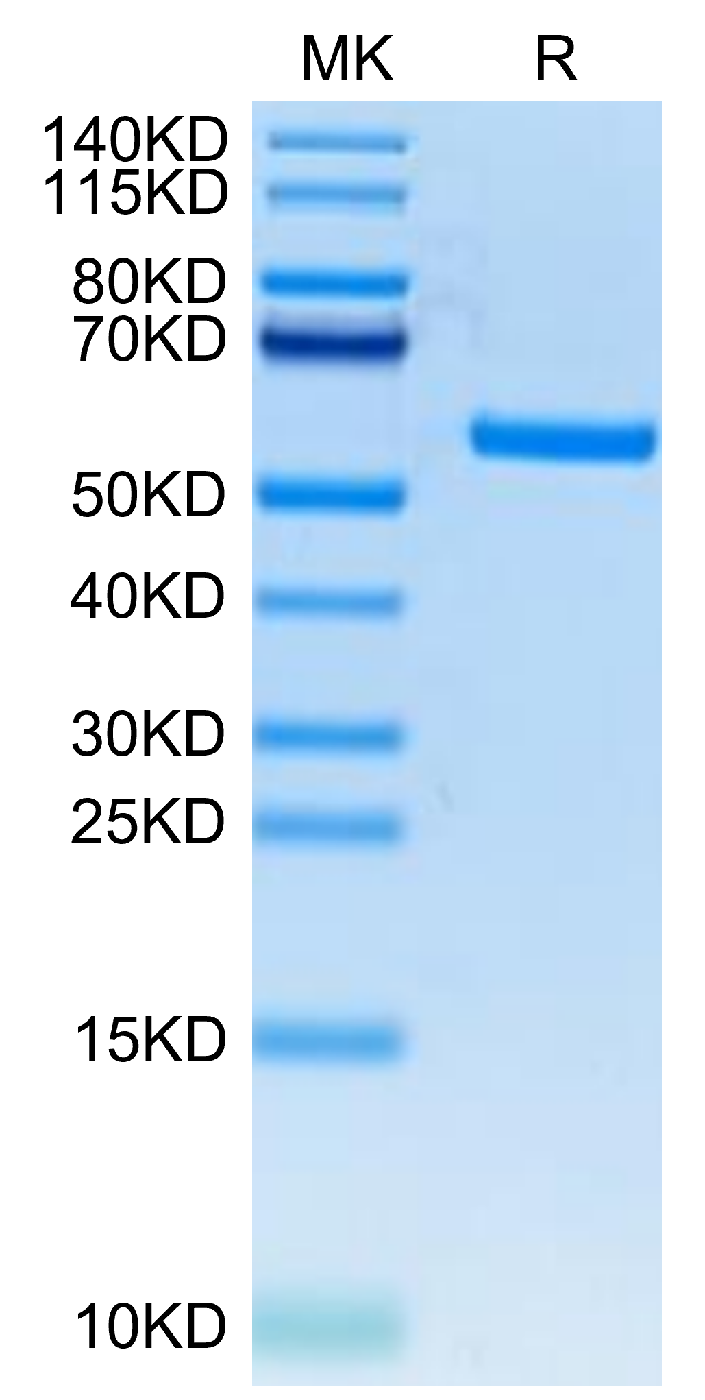 The protein has a predicted MW of 50.30 kDa. Due to glycosylation, the protein migrates to 55-60 kDa based on Bis-Tris PAGE result.