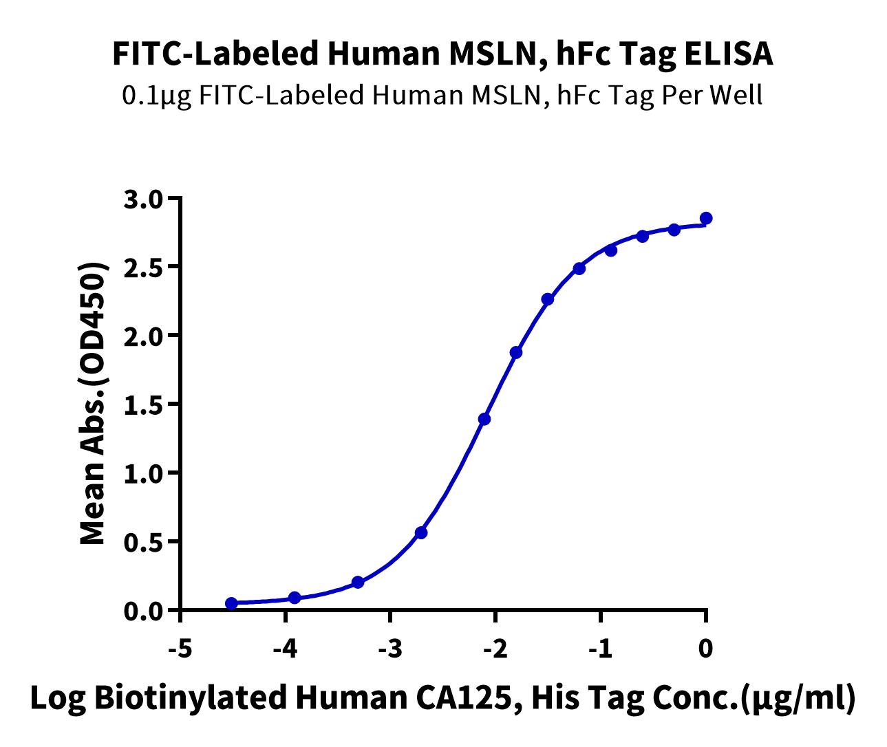 Recombinant FITC-Labeled Human MSLN/Mesothelin Protein is expressed from HEK293 with hFc (IgG1) tag at the C-Terminus.It contains Glu296-Gly580 [Accession | Q13421-2].