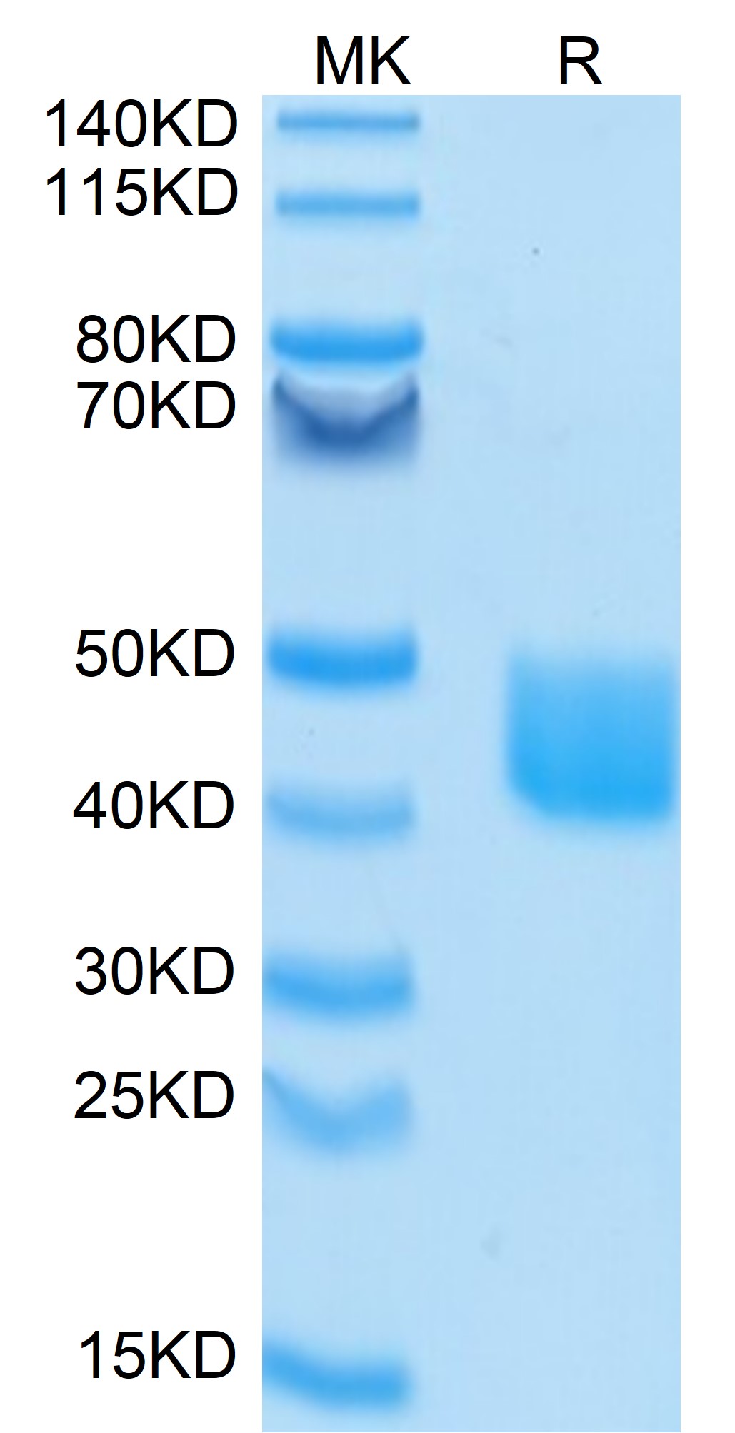 The protein has a predicted MW of 35.2 kDa. Due to glycosylation, the protein migrates to 40-50 kDa based on Bis-Tris PAGE result.