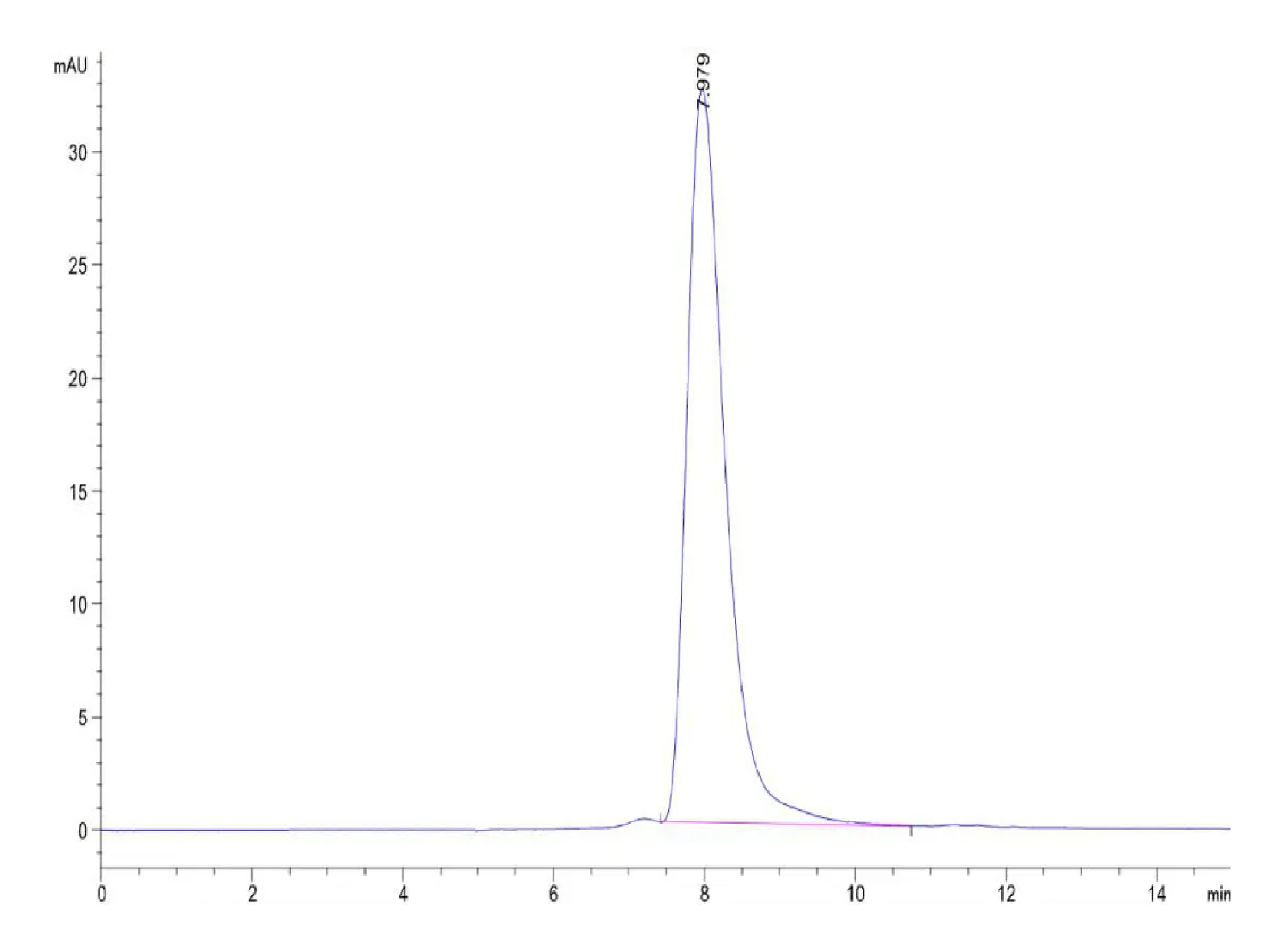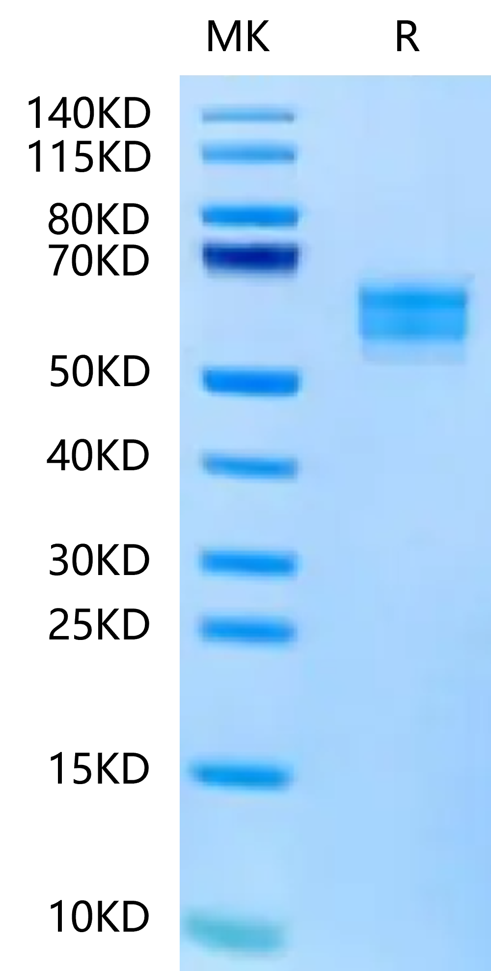 The protein has a predicted MW of 43.4 kDa. Due to glycosylation, the protein migrates to 50-70 kDa based on Bis-Tris PAGE result.