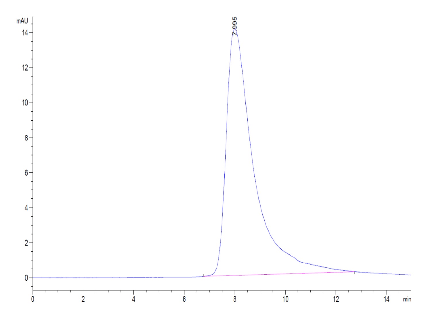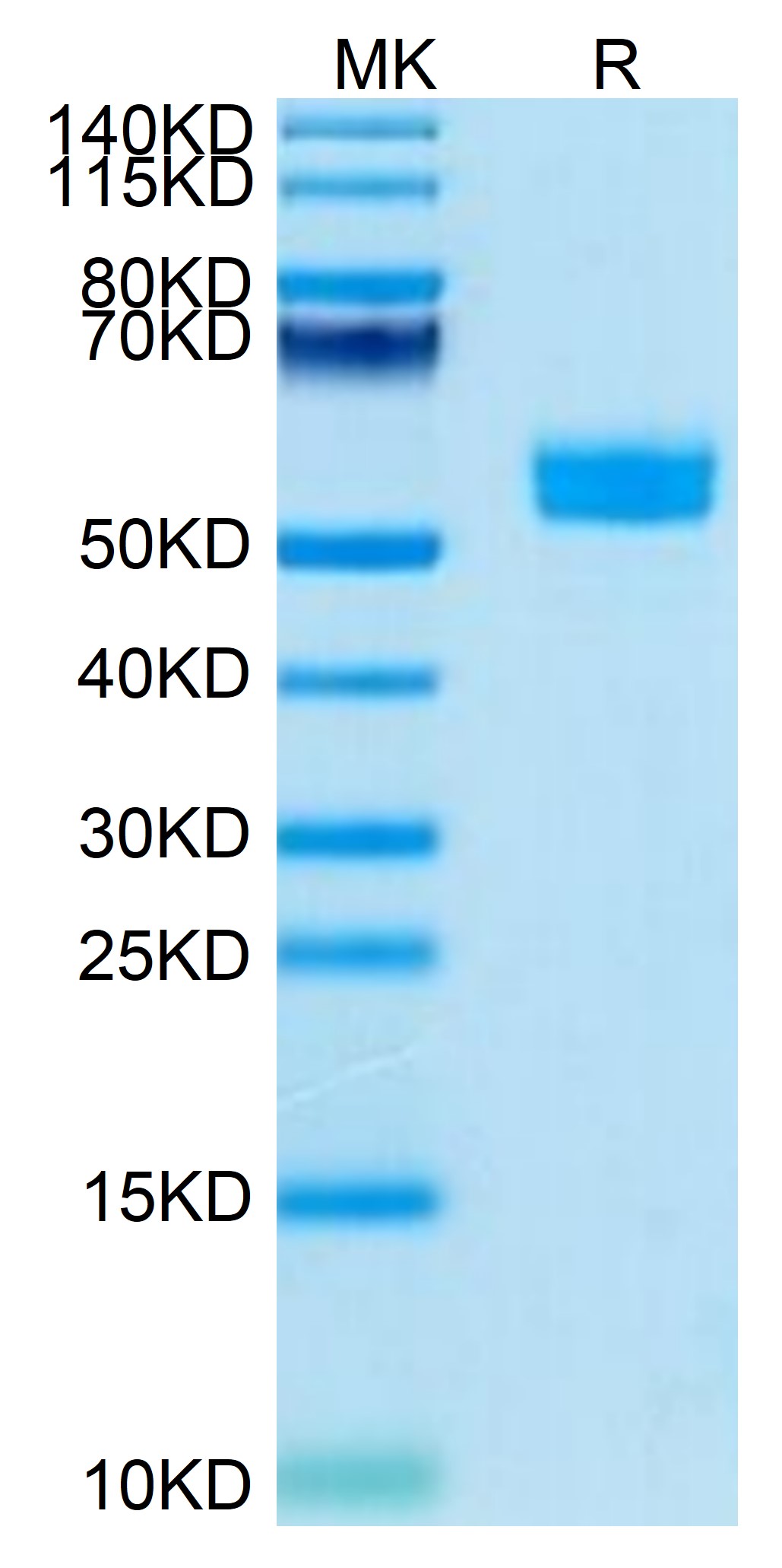 The protein has a predicted MW of 39.8 kDa. Due to glycosylation, the protein migrates to 53-60 kDa based on Bis-Tris PAGE result.