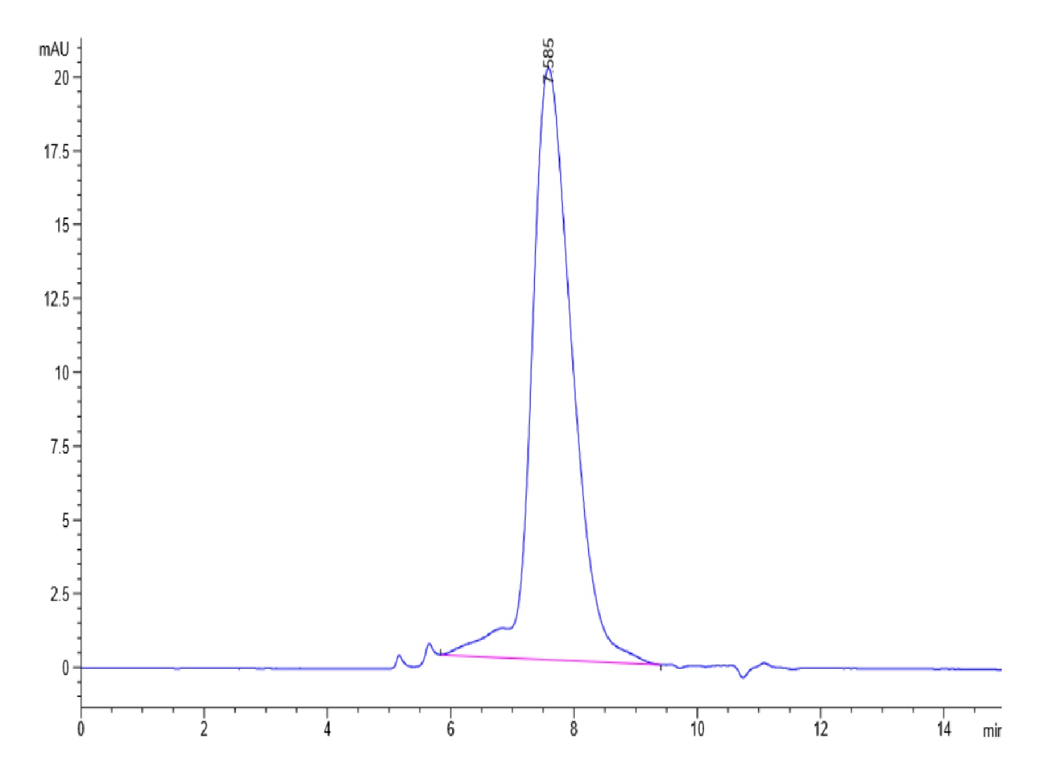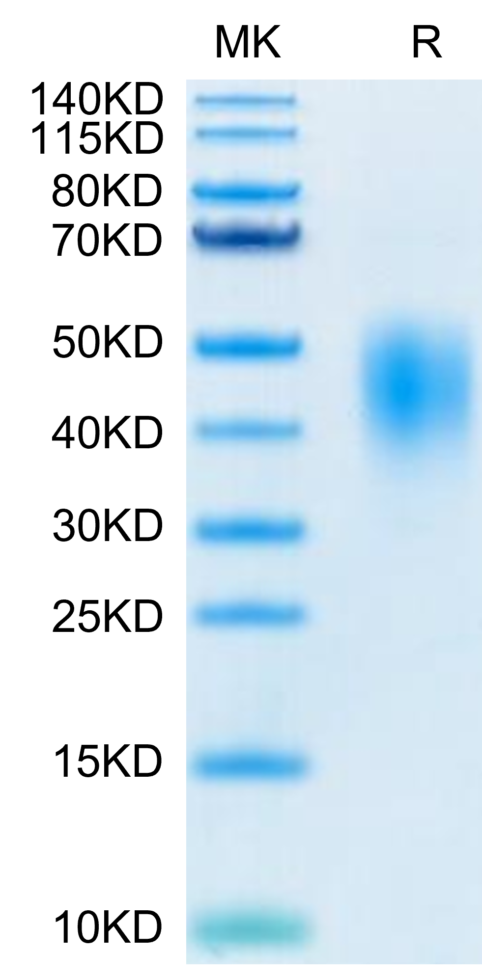 The protein has a predicted MW of 25.3 kDa. Due to glycosylation, the protein migrates to 40-52 kDa based on Bis-Tris PAGE result.