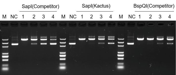 SapI 是一种 IIS 型限制性内切酶,能识别非回文 DNA 序列,并在识别序列之外进行切割产生粘性末端。同裂酶有 BspQI、PciSI、LguI。10×Cut Reaction Buffer 为含有重组白蛋白(rAlbumin)的反应缓冲液,确保了产品的安全性及稳定性。