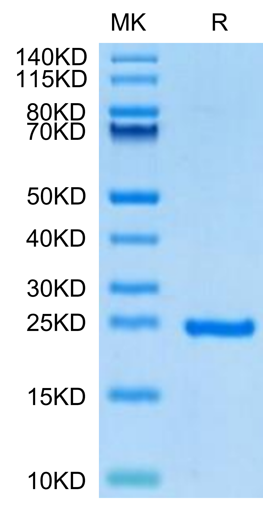 The protein has a predicted MW of 19.79 kDa kDa. The protein migrates to 23-25 kDa based on Bis-Tris PAGE result.