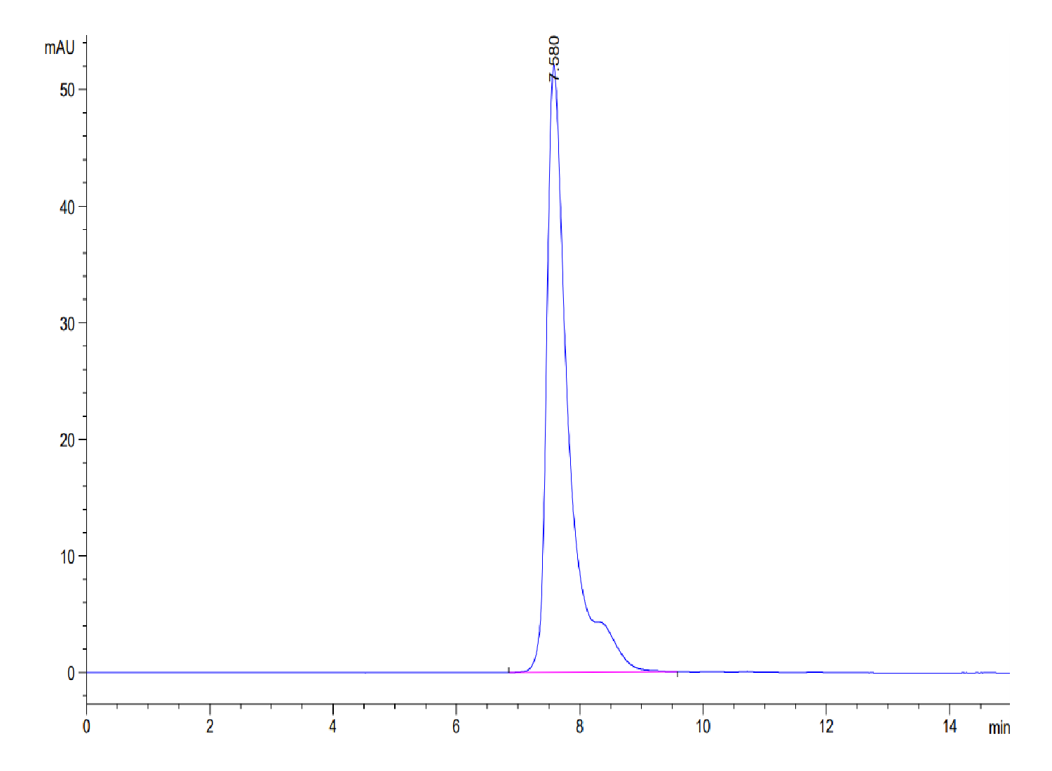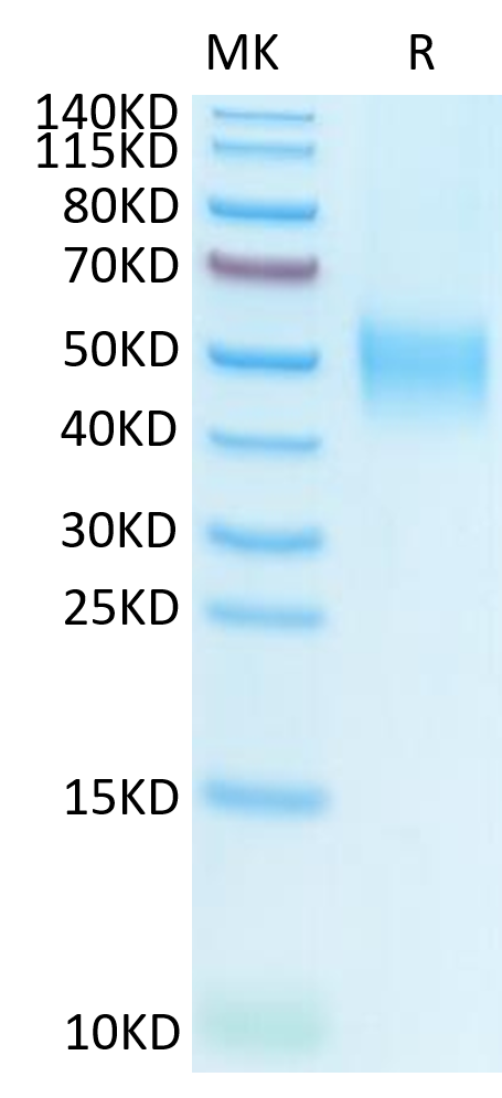 The protein has a predicted MW of 25.4 kDa. Due to glycosylation, the protein migrates to 40-60 kDa based on Bis-Tris PAGE result.