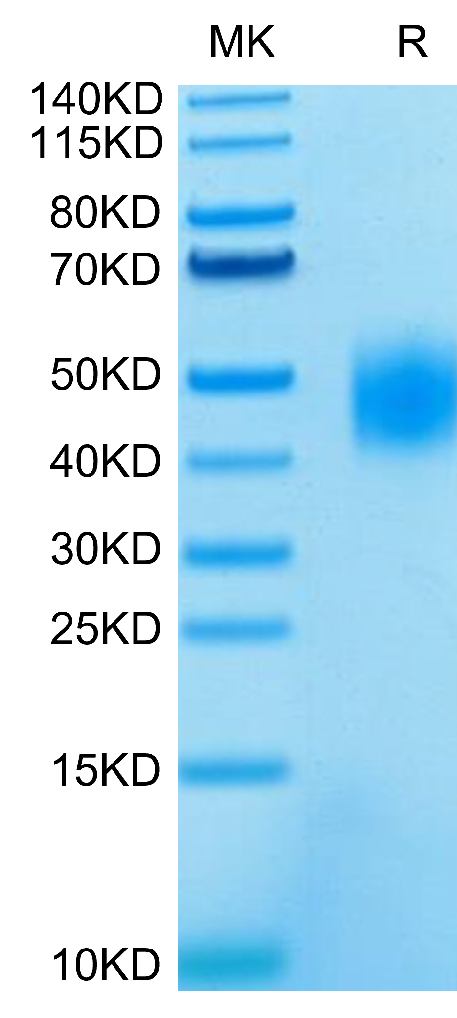 The protein has a predicted MW of 25.3 kDa. Due to glycosylation, the protein migrates to 40-55 kDa based on Bis-Tris PAGE result.