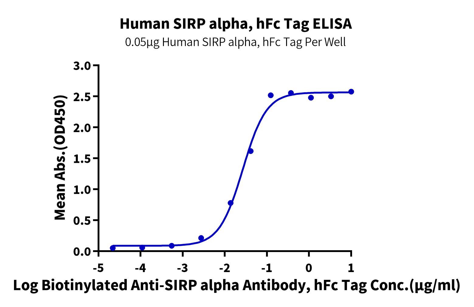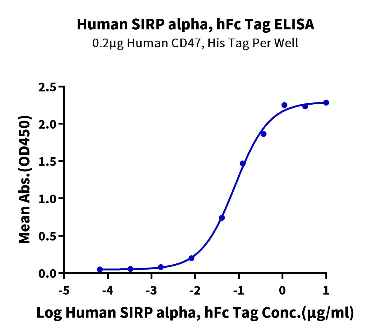 Recombinant Human SIRP alpha/CD172a Protein is expressed from HEK293 with hFc tag at the C-Terminus.It contains Glu31-Arg370 [Accession | P78324-1].