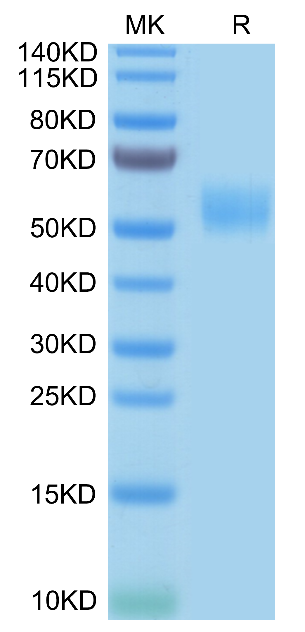 The protein has a predicted MW of 40 kDa. Due to glycosylation, the protein migrates to 52-60 kDa based on Bis-Tris PAGE result.