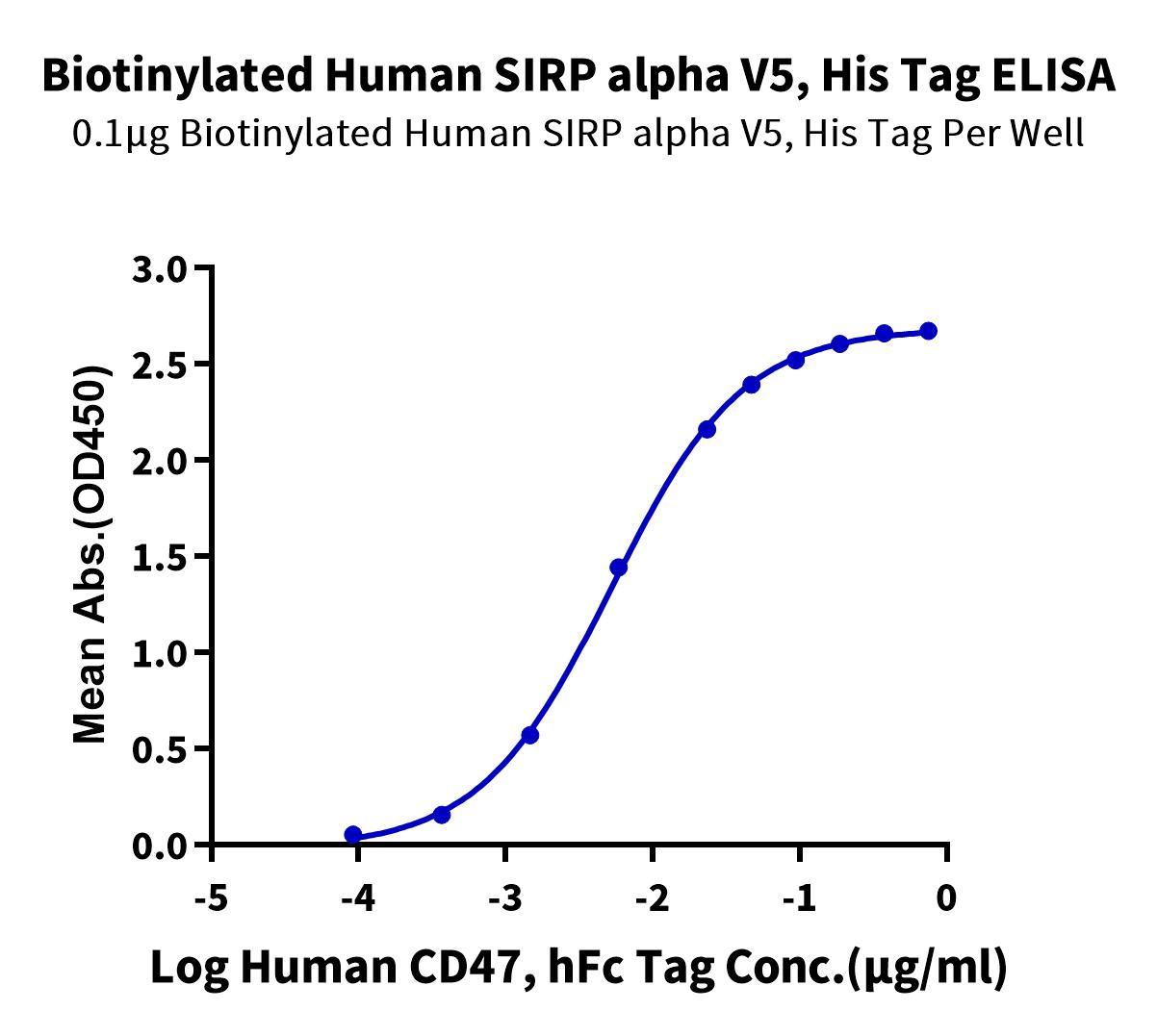 Recombinant Biotinylated Human SIRP alpha V5 Protein is expressed from HEK293 with His tag and Avi tag at the C-Terminus.It contains Glu31-Arg370(S42F) [Accession | P78324-1].
