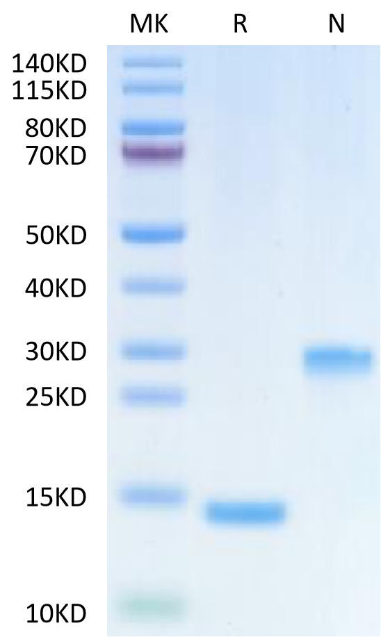 The protein has a predicted MW of 13.2 kDa (monomer). Due to glycosylation, the protein migrates to 14-15 kDa (monomer) under reduced (R) condition and 26-30 kDa (dimer) under Non reduced (N) condition based on Bis-Tris PAGE result.