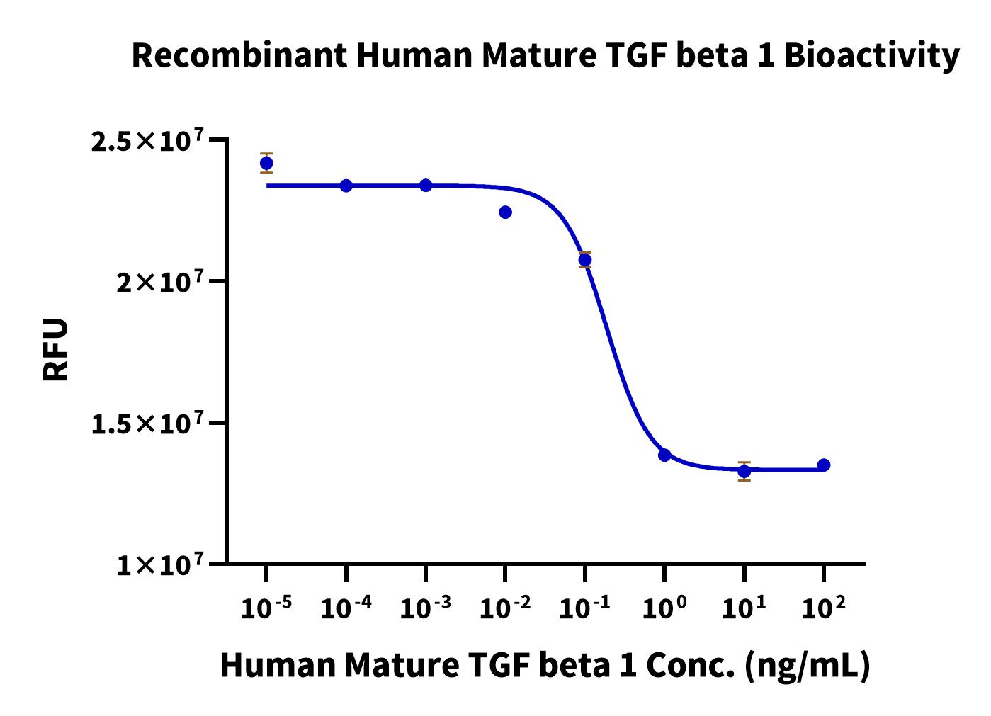TGF-beta 1 (transforming growth factor beta 1) is one of three closely related mammalian members of the large TGF-beta superfamily that share a characteristic cystine knot structure. TGF-beta 1, -2 and -3 are highly pleiotropic cytokines that are proposed to act as cellular switches that regulate processes such as immune function, proliferation and epithelial-mesenchymal transition.Transforming growth factor beta-1 is multifunctional protein that regulates the growth and differentiation of various cell types and is involved in various processes, such as normal development, immune function, microglia function and responses to neurodegeneration.