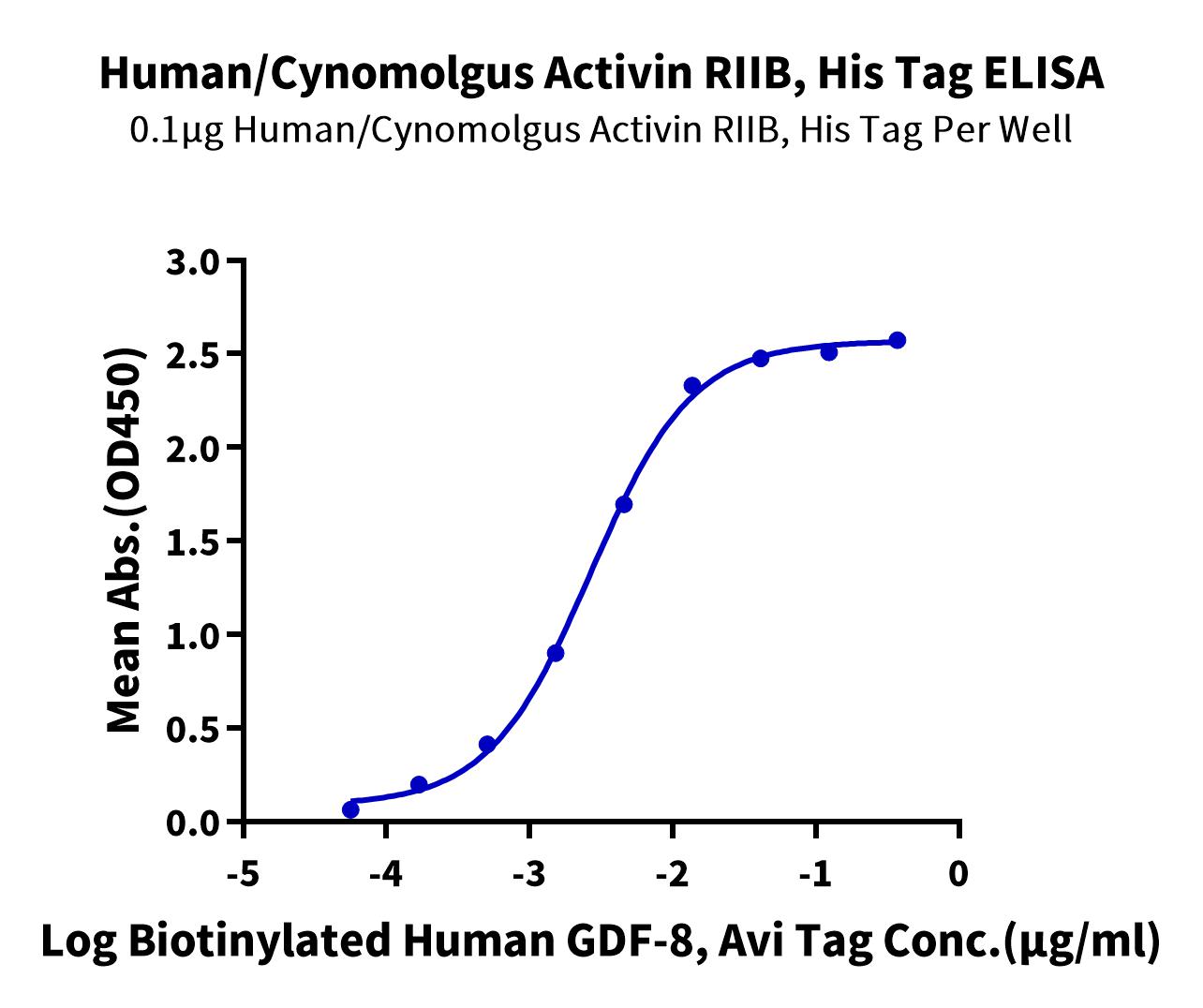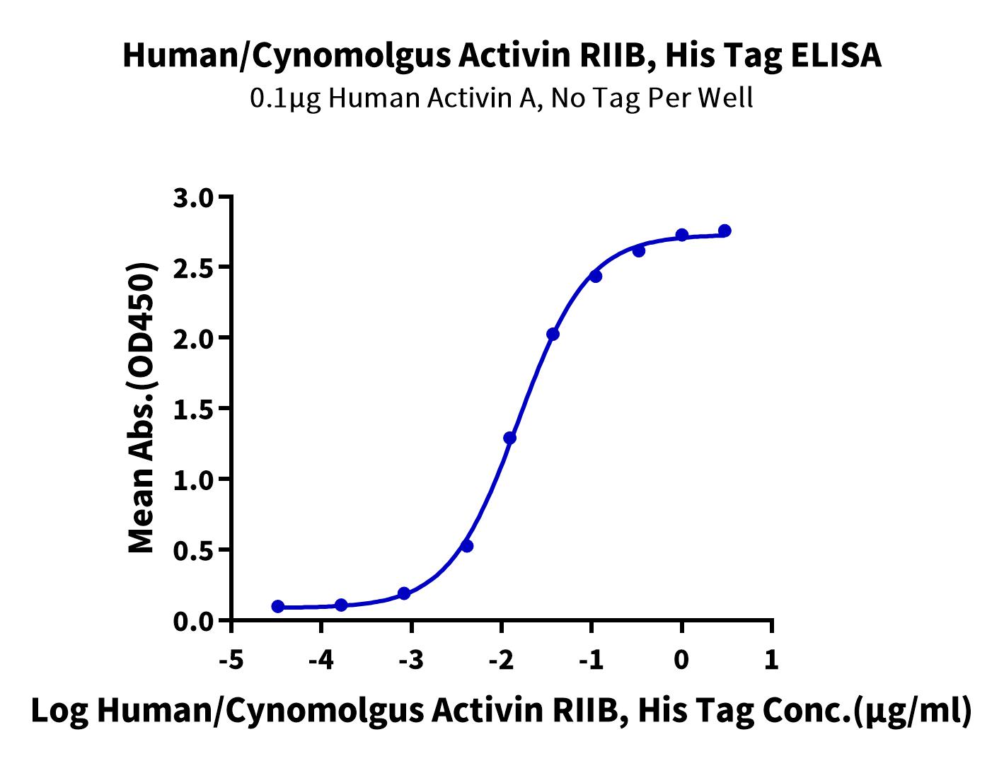 Recombinant Human/Cynomolgus Activin RIIB/ACVR2B Protein is expressed from HEK293 with His tag at the C-terminus.It contains Ser19-Thr137 (Human) / Ser40-Thr158 (Cynomolgus) [Accession | Q13705-1(Human) / XP_045242398.1(Cynomolgus)].