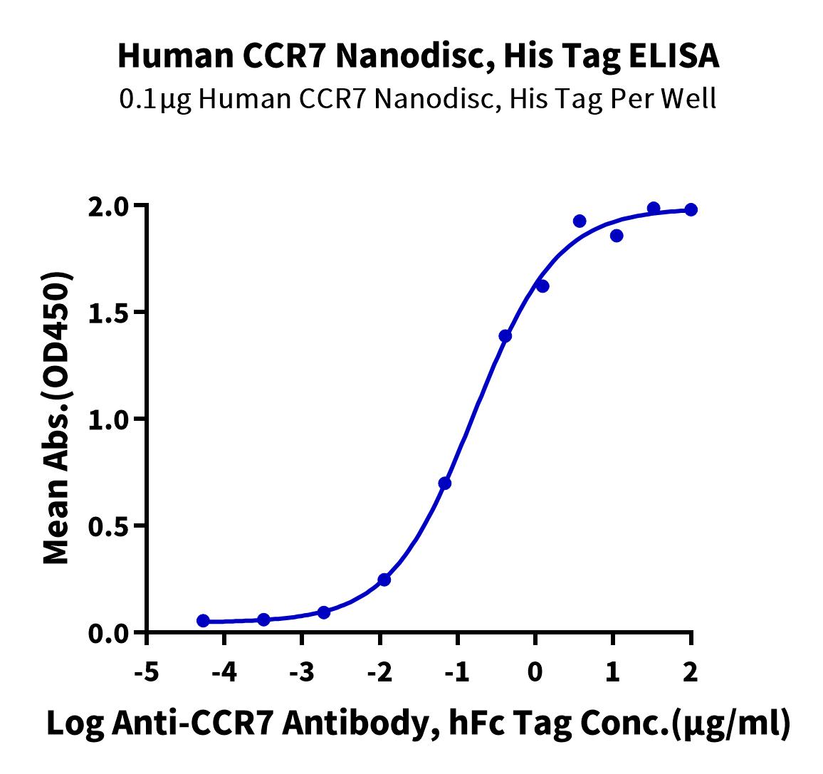 Recombinant Human CCR7 Nanodisc is expressed from HEK293 with His tag at the C-terminus (FITC-equivalent protein is fused on cytoplasmic part).It contains Met1-Pro378 [Accession | P32248].
