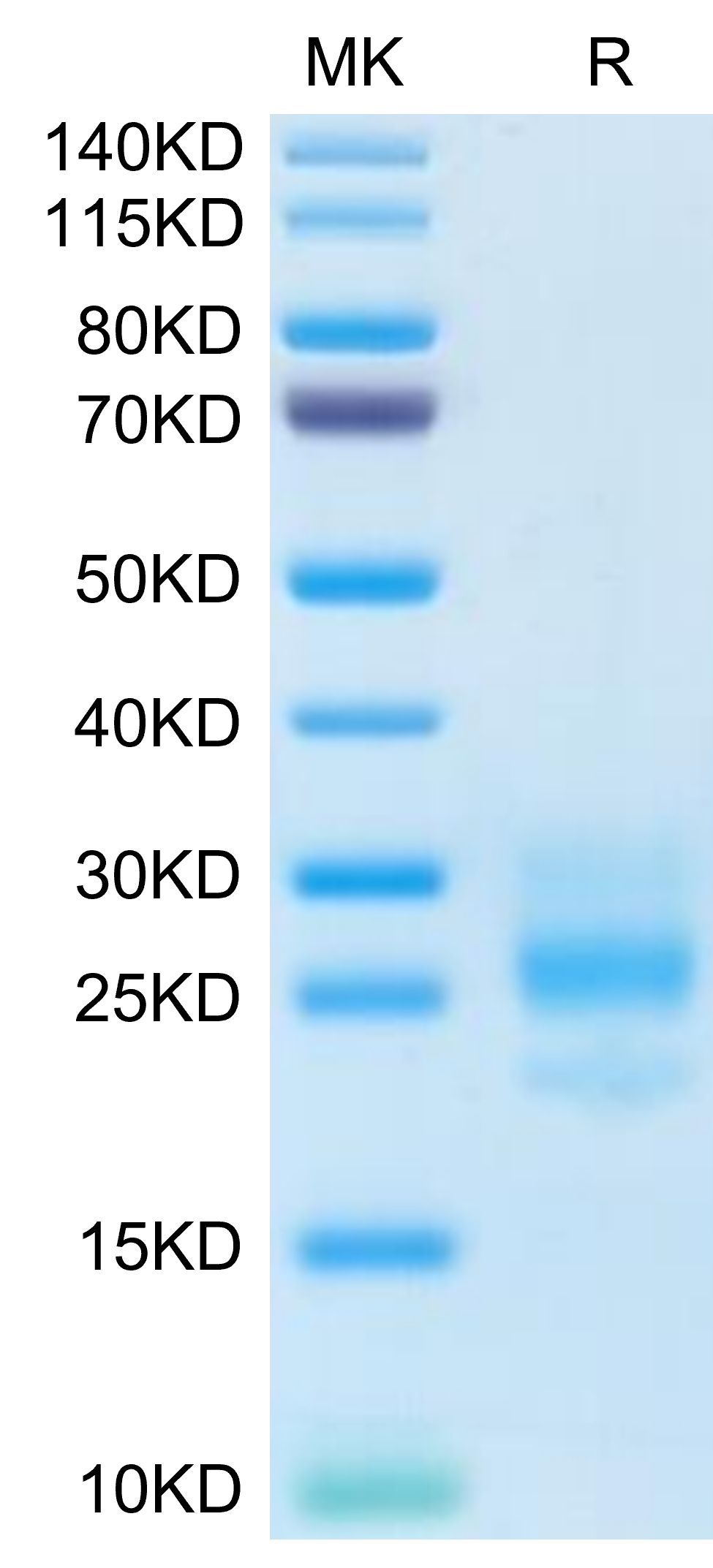 The protein has a predicted MW of 18.40 kDa. Due to glycosylation, the protein migrates to 23-28 kDa based on Bis-Tris PAGE result.