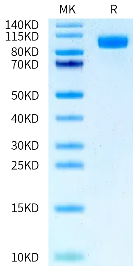 The protein has a predicted MW of 71.5 kDa. Due to glycosylation, the protein migrates to 90-115 kDa based on Bis-Tris PAGE result.