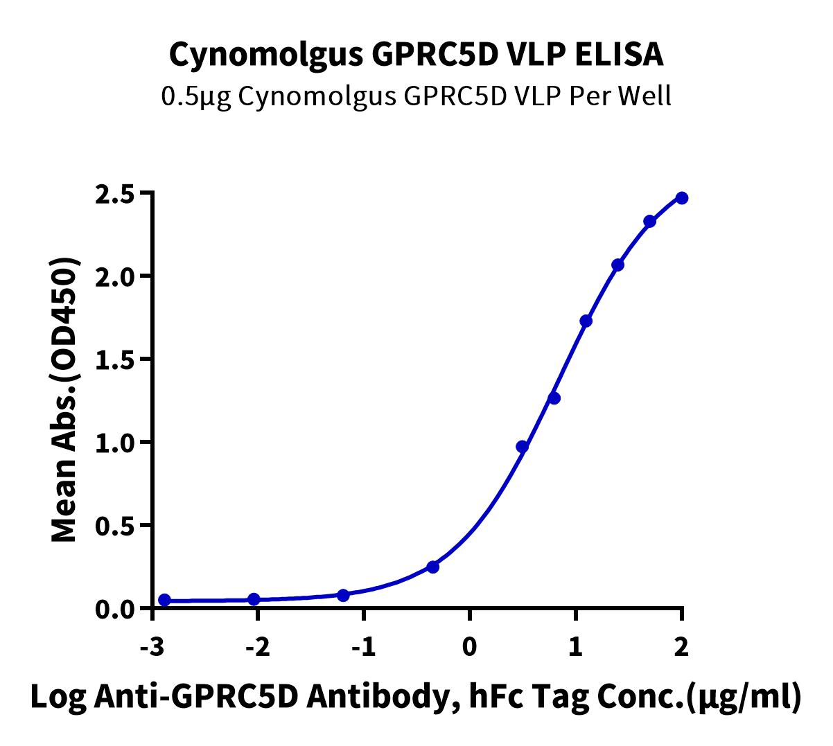 Recombinant Cynomolgus GPRC5D VLP is expressed from HEK293. It contains Met1-Cys300 (It may have cross reaction with anti-His antibody) [Accession | A0A2K5W6I7]. |