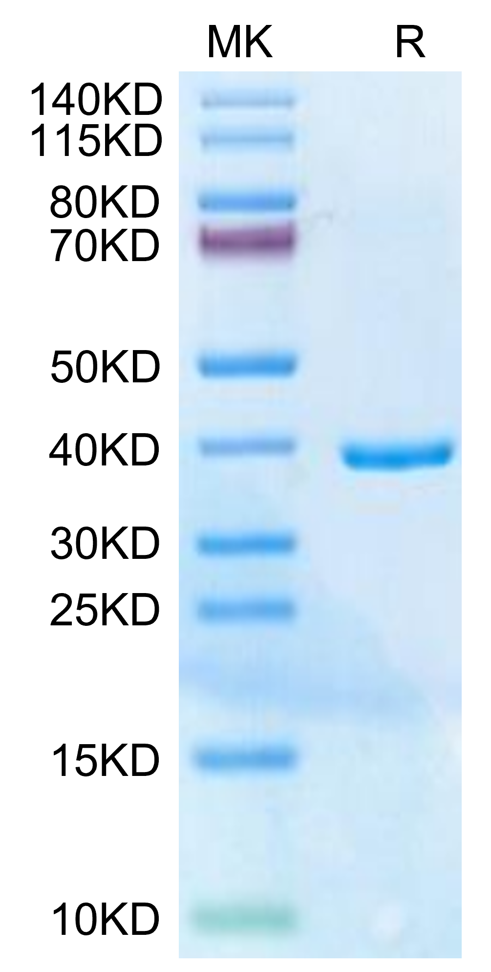 The protein has a predicted MW of 35.5 kDa. The protein migrates to 36-40 kDa based on Bis-Tris PAGE result.