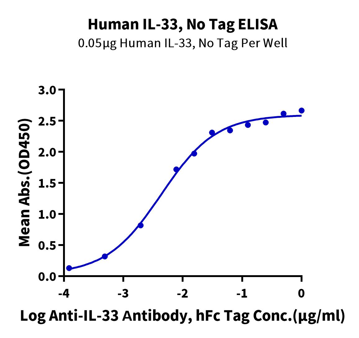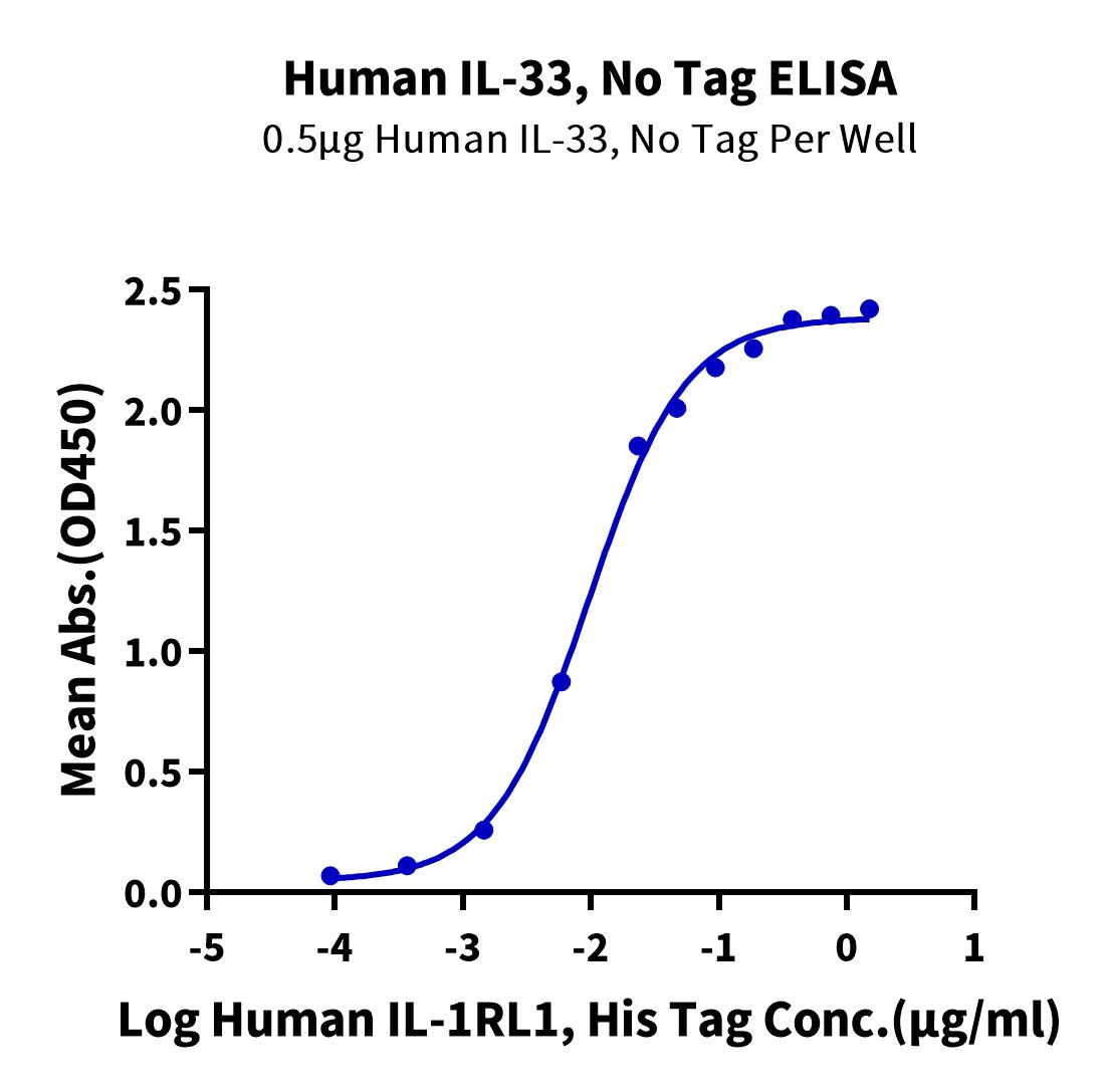 Interleukin-33 (IL-33) is a cytokine belonging to the IL-1 family, playing a role in inflammatory, infectious and autoimmune diseases and expressed in the cellular nucleus in several tissues. High levels of IL-33 are expressed in epithelial barrier tissues and endothelial barriers. ST2 is a receptor for IL-33, expressed selectively on a subset of Th2 cells, mediating some of their functions.