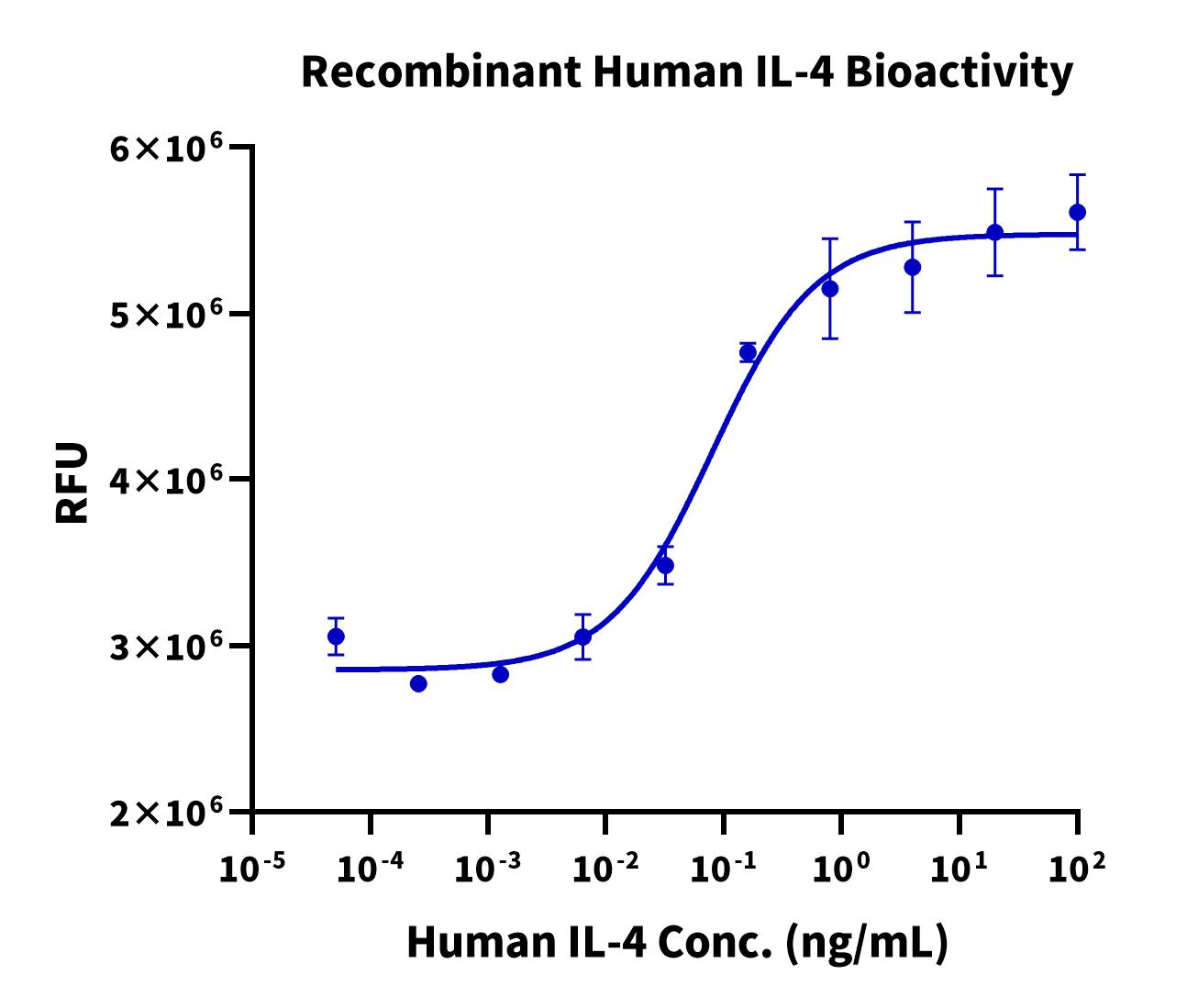 Immobilized Human IL-4, No Tag at 1μg/ml (100μl/well) on the plate. Dose response curve for Human IL-4 R alpha, hFc Tag with the EC50 of 4.4ng/ml determined by ELISA. (QC Test)
