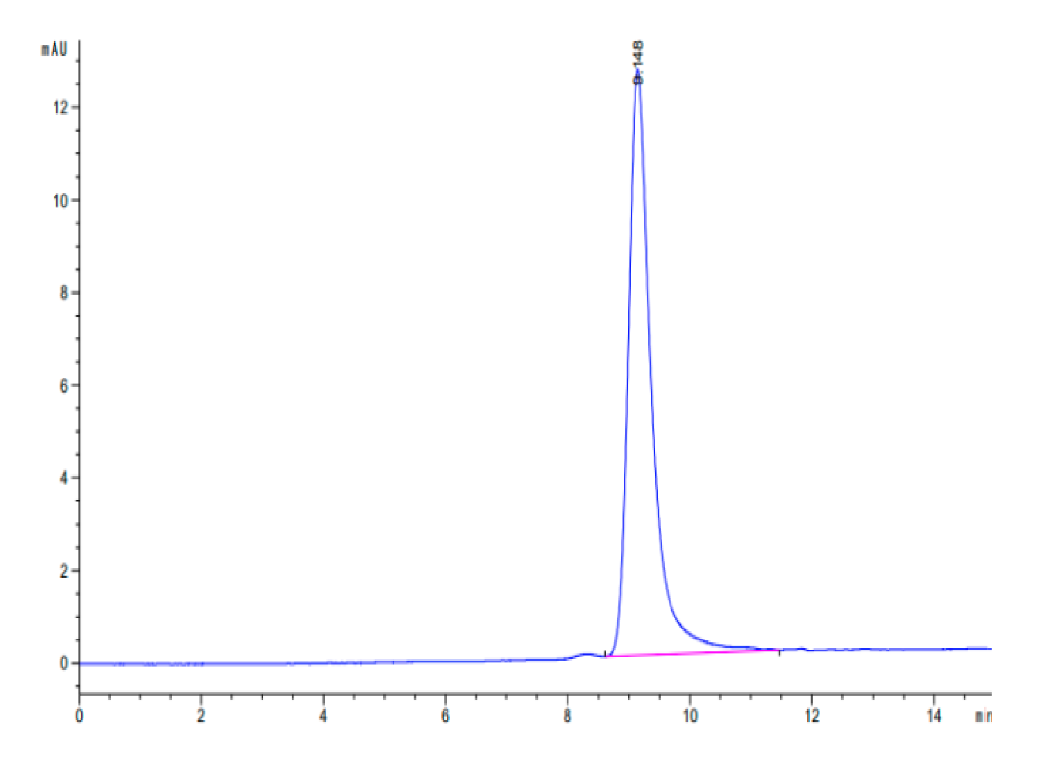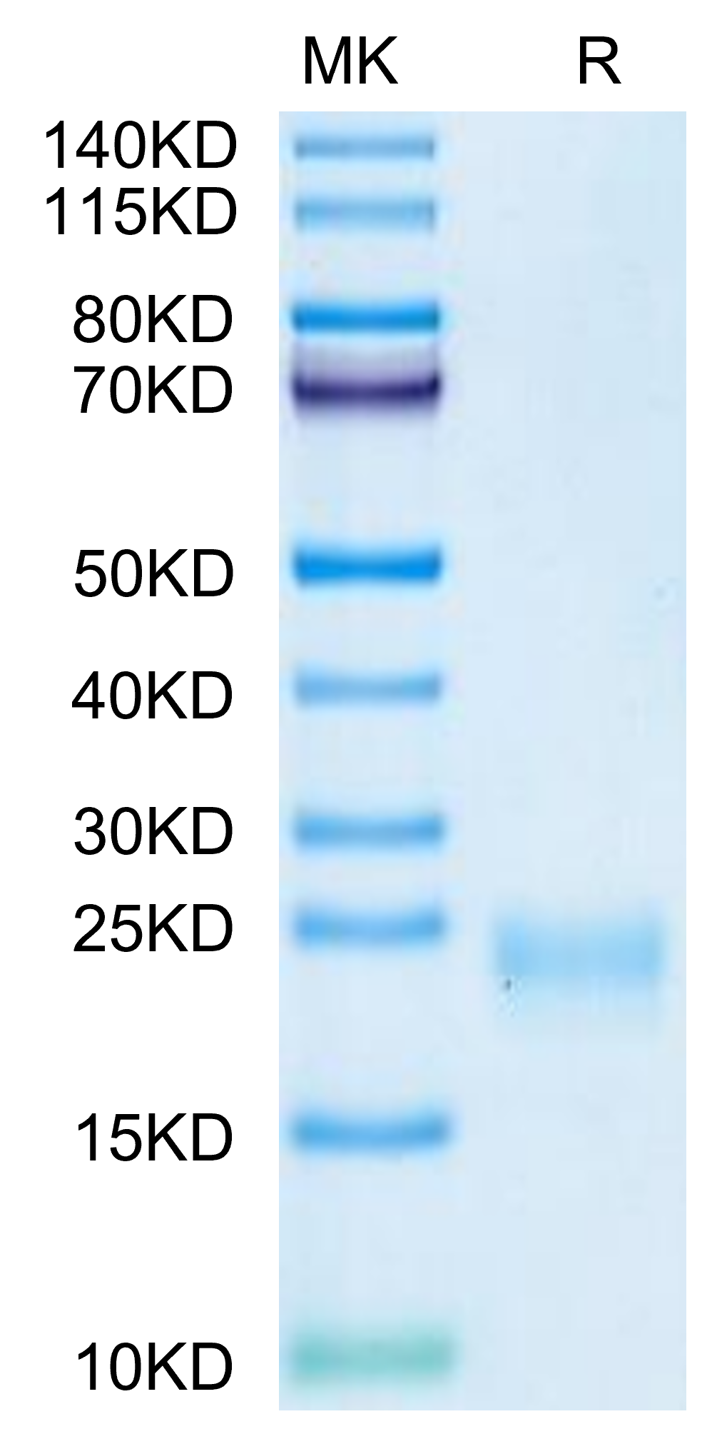 The protein has a predicted MW of 14.25 kDa. Due to glycosylation, the protein migrates to 20-25 kDa based on Bis-Tris PAGE result.