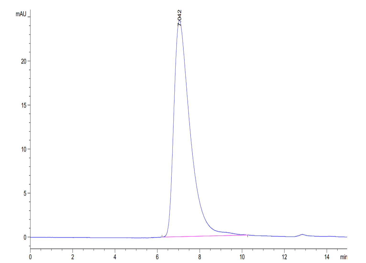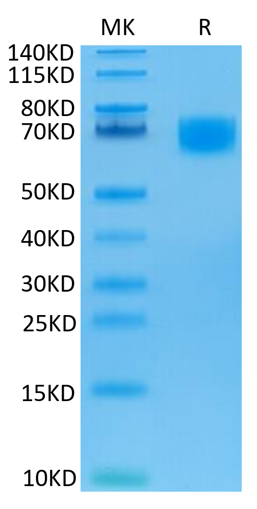 The protein has a predicted MW of 49.2 kDa. Due to glycosylation, the protein migrates to 65-75 kDa based on Bis-Tris PAGE result.