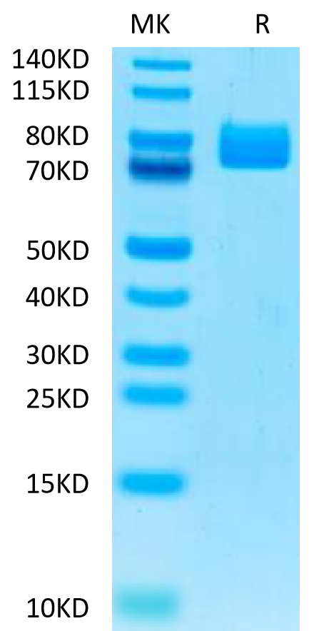 The protein has a predicted MW of 58.17 kDa. Due to glycosylation, the protein migrates to 75-95 kDa based on Bis-Tris PAGE result.