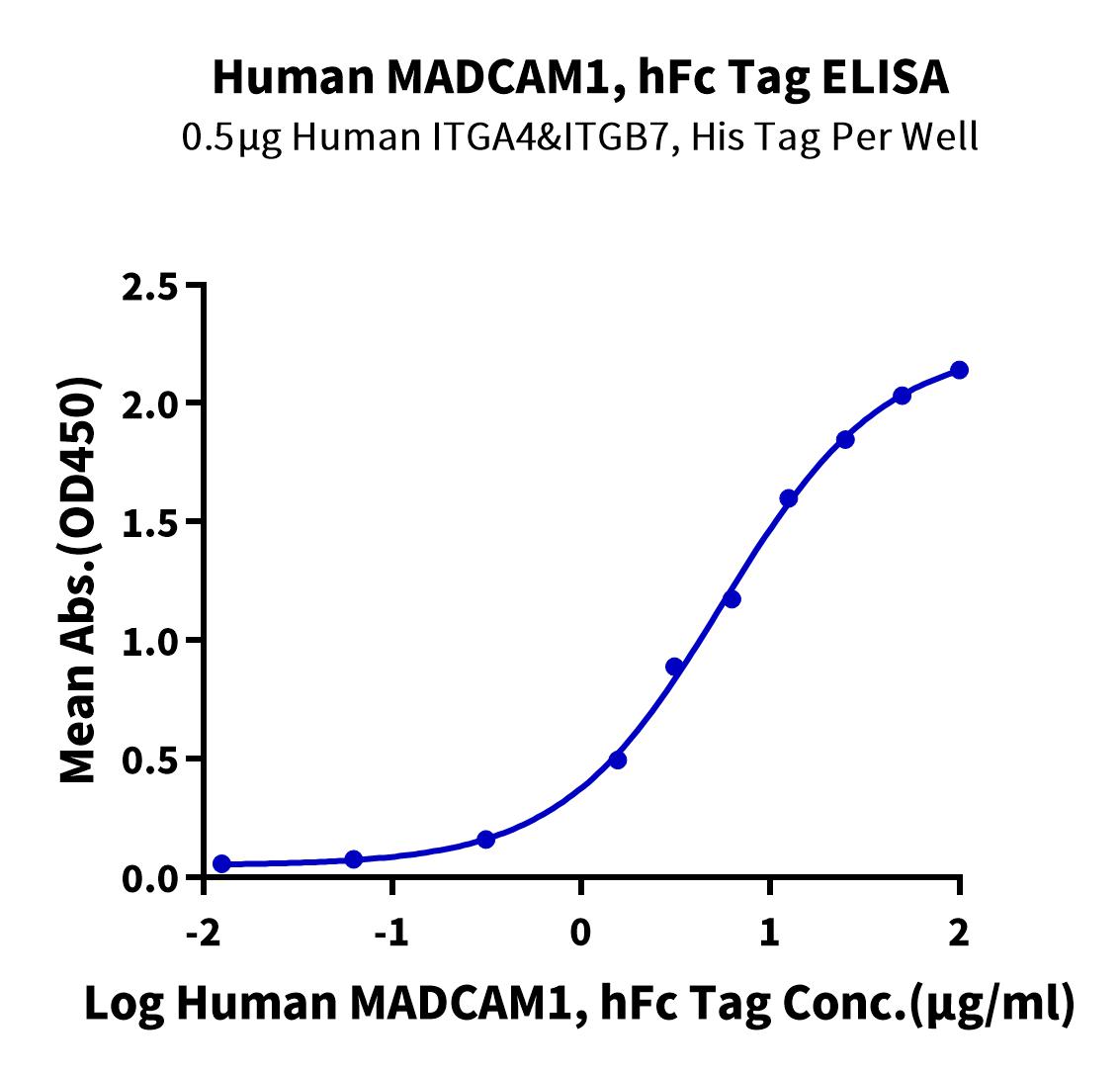 Recombinant Human MADCAM1 Protein is expressed from HEK293 with hFc tag at the C-Terminus.It contains Gln19-Gln317 [Accession | Q13477-1].