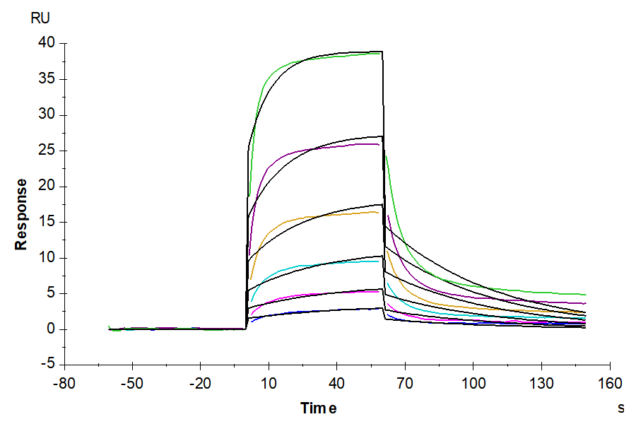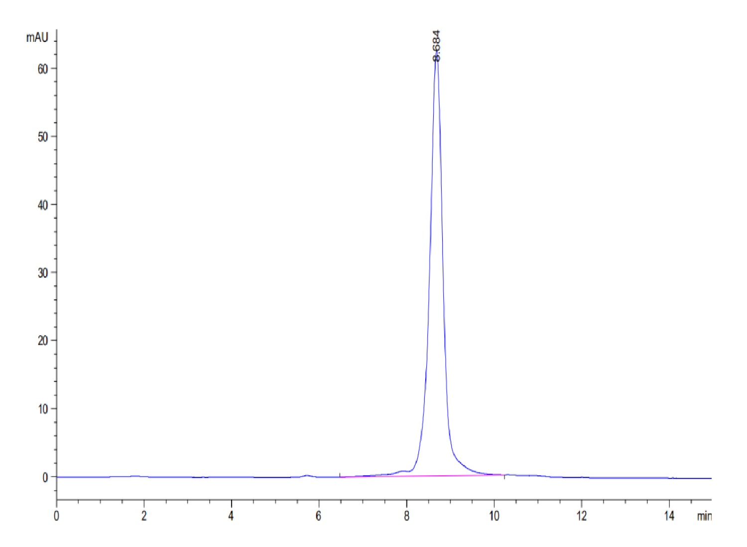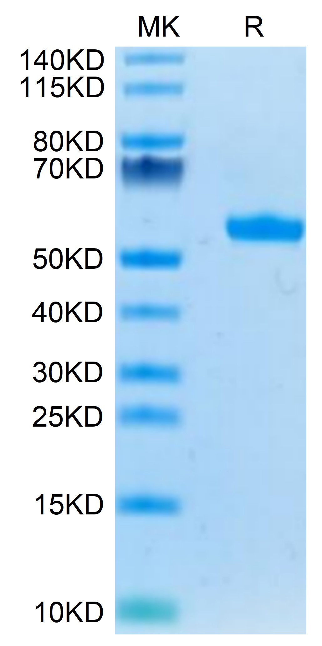 The protein has a predicted MW of 50.2 kDa. Due to glycosylation, the protein migrates to 55-60 kDa based on Bis-Tris PAGE result.