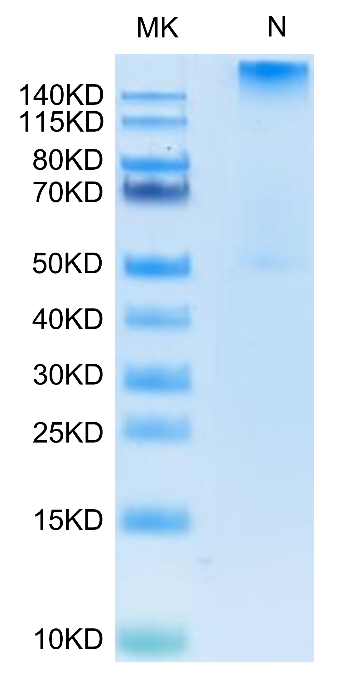 The protein has a predicted MW of 258 kDa. Due to glycosylation, the protein migrates to 260-265 kDa under Non reduced (N) condition based on Bis-Tris PAGE result.